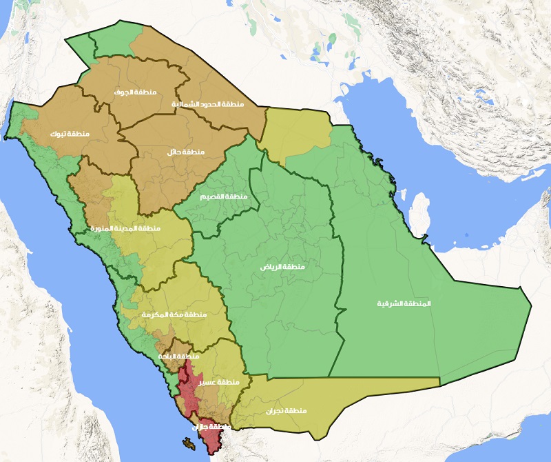 قالت الأرصاد إن الطقس اليوم في السعودية مهيأ لسقوط أمطار رعدية متوسطة الى غزيرة تؤدي إلى جريان السيول مصحوبة بزخات من البرد ورياح نشطة تحد من مدى الرؤية الافقية على أجزاء من مناطق الحدود الشمالية، الجوف، تبوك، حائل والمدينة المنورة تمتد الى أجزاء من مناطق مكة المكرمة، الباحة، عسير وجازان.