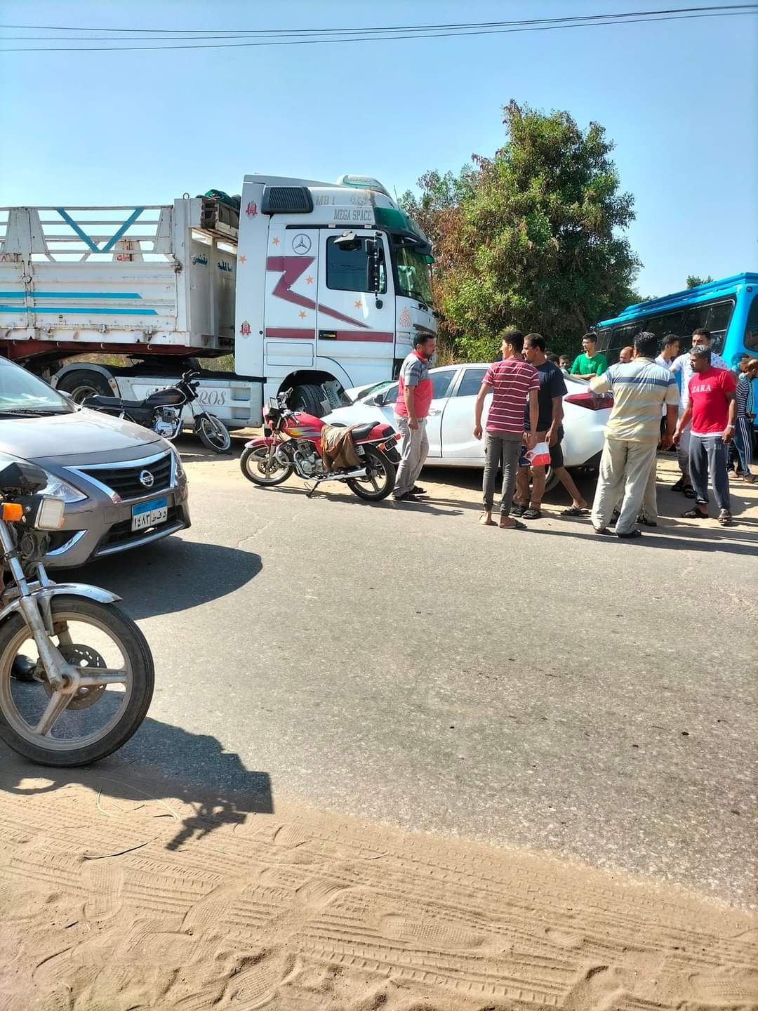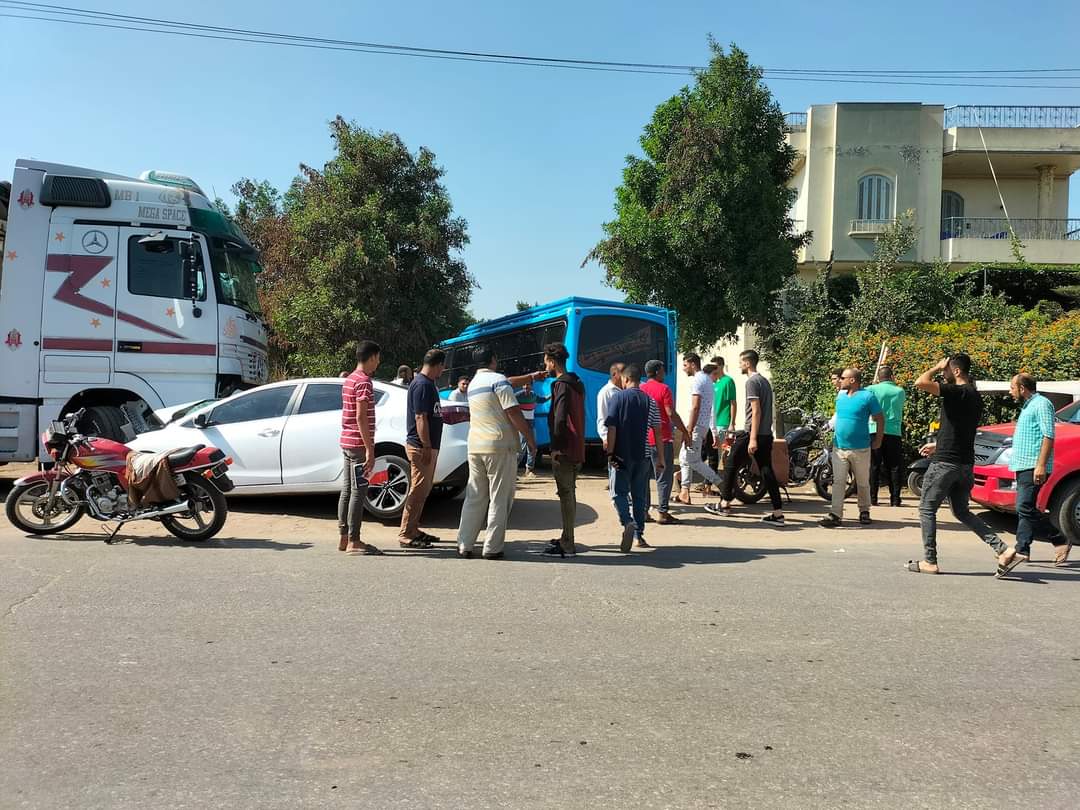 وانتقل على الفور ضباط وحدة مباحث المركز لمكان البلاغ، وبالفحص تبين أن سيارة ملاكي دون لوحات معدنية يستقلها شخص وزوجة شقيقه ونجلها، صدمت سيدة أثناء عبورها الطريق، ونتيجة اختلال عجلة القيادة في يد السائق، اصطدم بالمواجهة في سيارة نقل ثقيل متوقفة على الطريق.