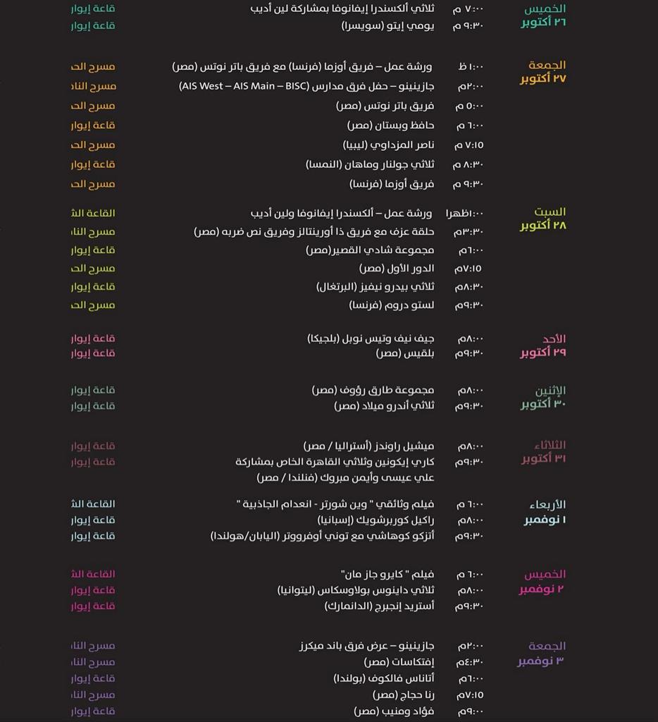 في حين تحتضن المشاركات المصرية توليفة من نجوم الجاز الشباب، مثل الفنانة بلقيس وفرقة الدور الأول وفرقة افتكاسات وعازف الساكسفون شادي القصير وحفل الثنائي حافظ وبستان والفنانة رنا حجاج وطارق رؤوف.