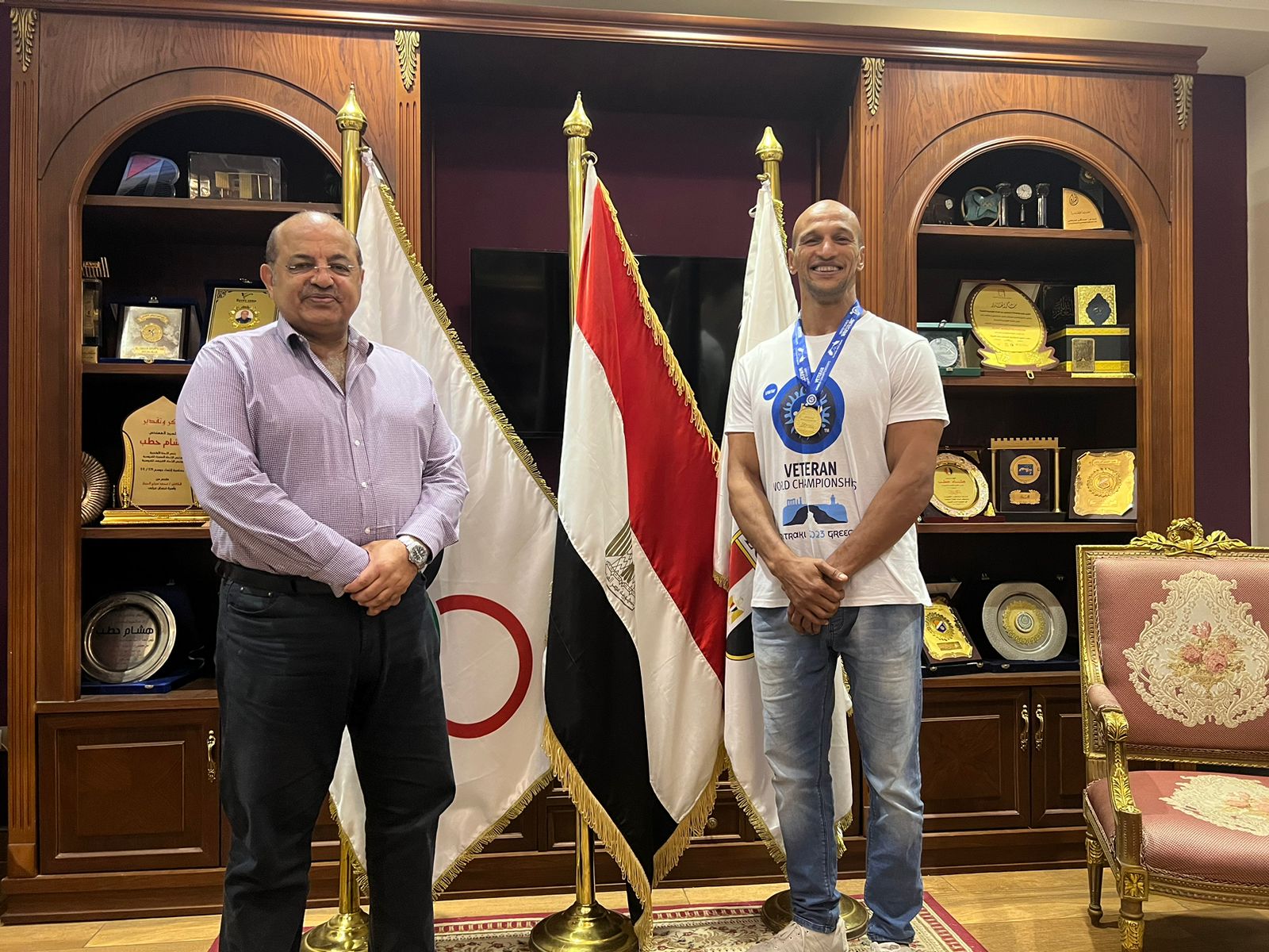 هشام حطب يكرم كرم جابر بعد حصوله على ذهبية العالم للرواد للمصارعة