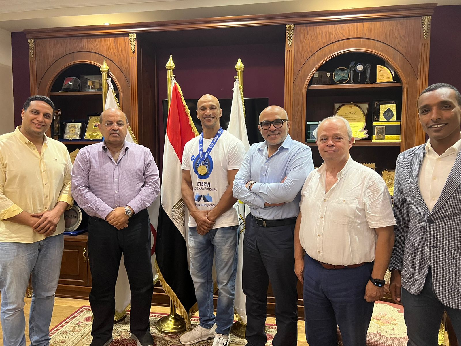 وحرص المهندس هشام حطب على تكريم البطل الأولمبي كرم جابر، وتهنئته على تحقيق ذهبية ببطولة العالم للمصارعة الرومانية بعد منافسة قوية.