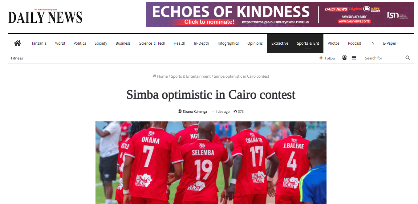 واهتمت صحف تنزانيا بمباراة الأهلي وسيمبا التنزاني، حيث نشرت صحيفة Daily News تقريرًا بعنوان “سيمبا متفائل بمباراة القاهرة”.