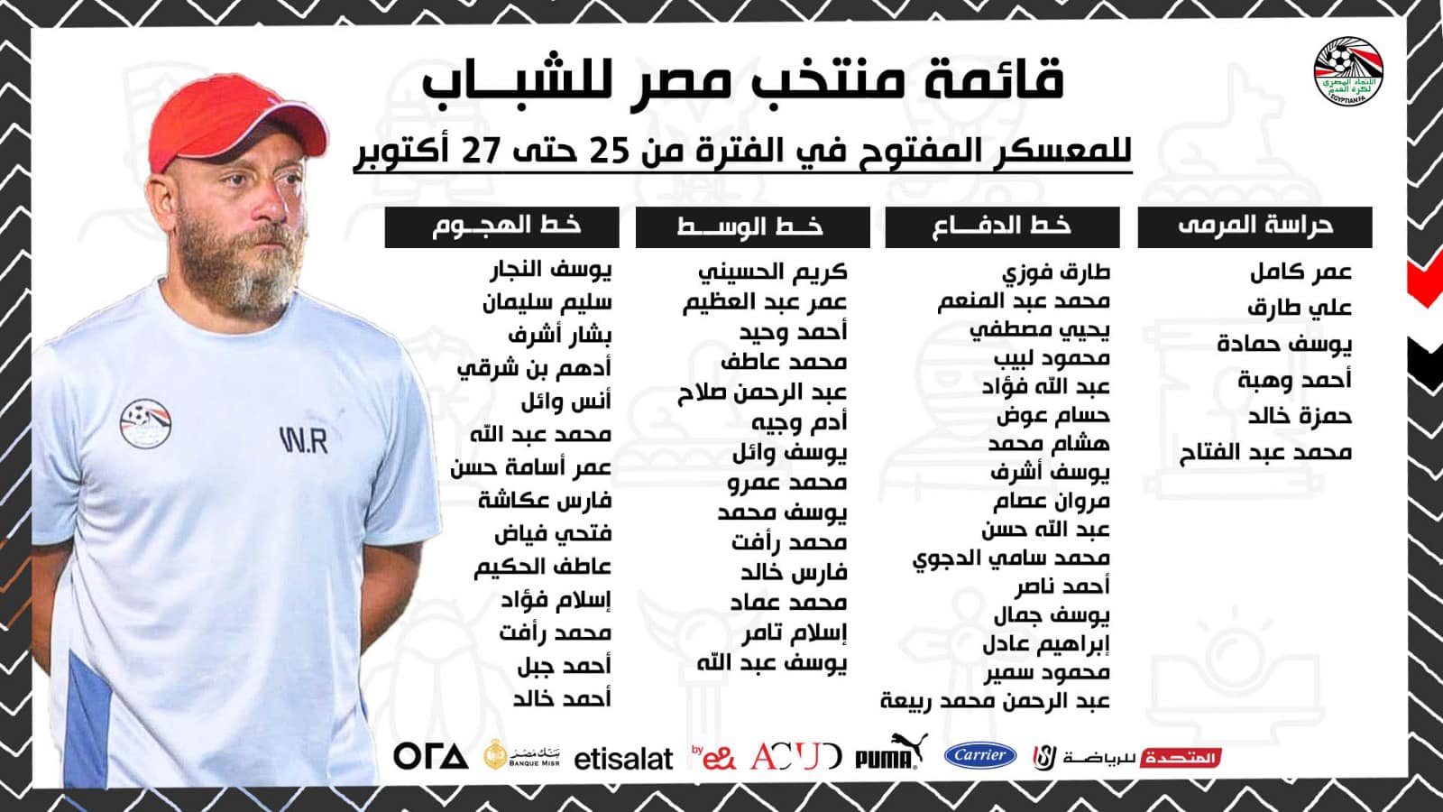 أعلن وائل رياض المدير الفني لمنتخب مصر للشباب، قائمة اللاعبين لمعسكر المنتخب المفتوح في الفترة من 25 حتي 27 أكتوبر، وتضم 50 لاعبا ضمن خطة الجهاز الفني لمشاهدة أكبر عدد من اللاعبين واختيار أفضل العناصر.