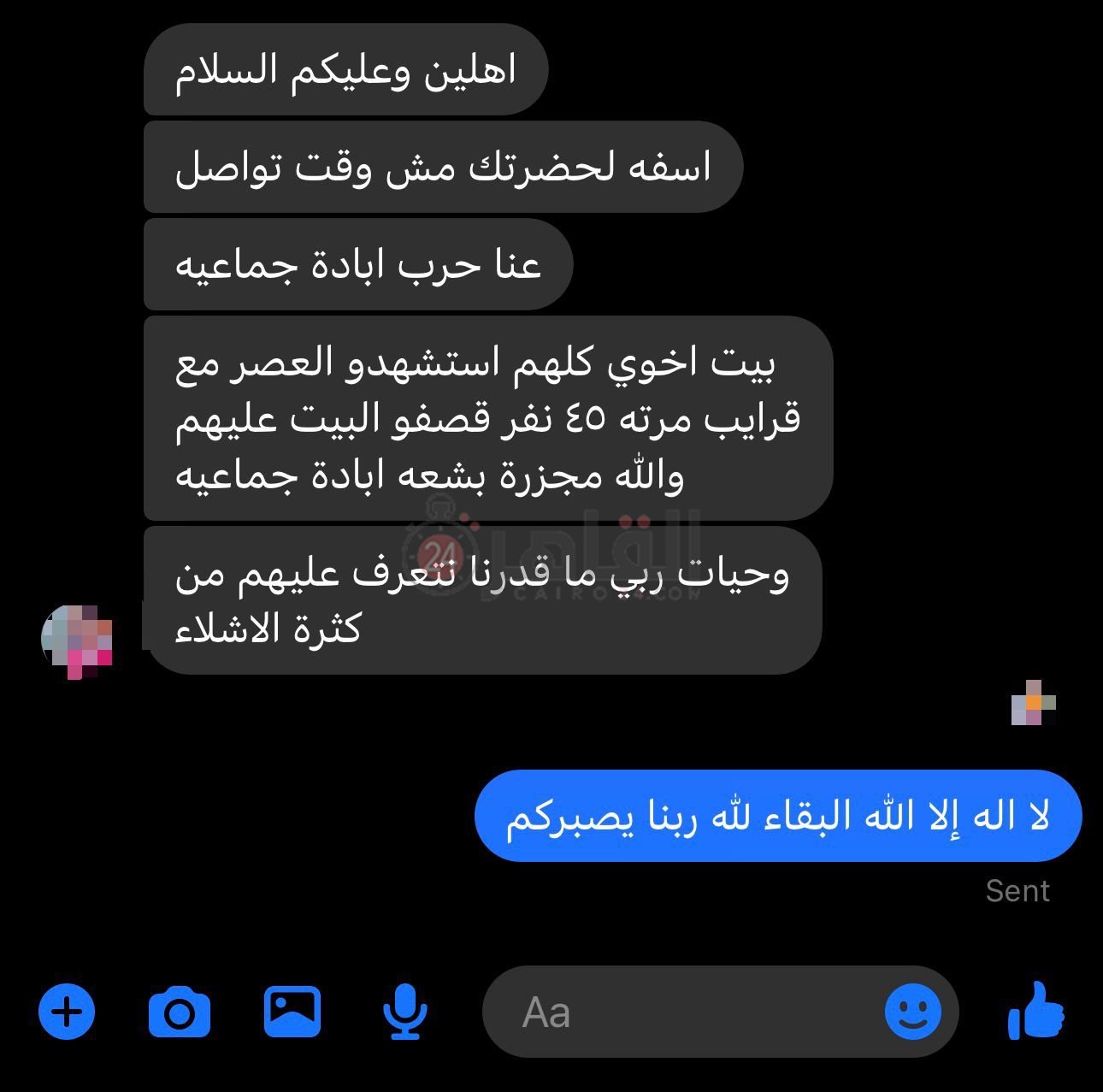 وفي رسالتها لـ القاهرة 24، قالت السيدة الفلسطينية: آسفة لحضرتك، مش وقت تواصل عنا حرب إبادة جماعية بيت أخوي كلهم استشهدوا العصر مع قرايب مرته 45 نفر قصفوا البيت عليهم والله مجزرة بشعة إبادة جماعية وحيات ربي ما قدرنا نتعرف عليهم من كثرة الأشلاء.