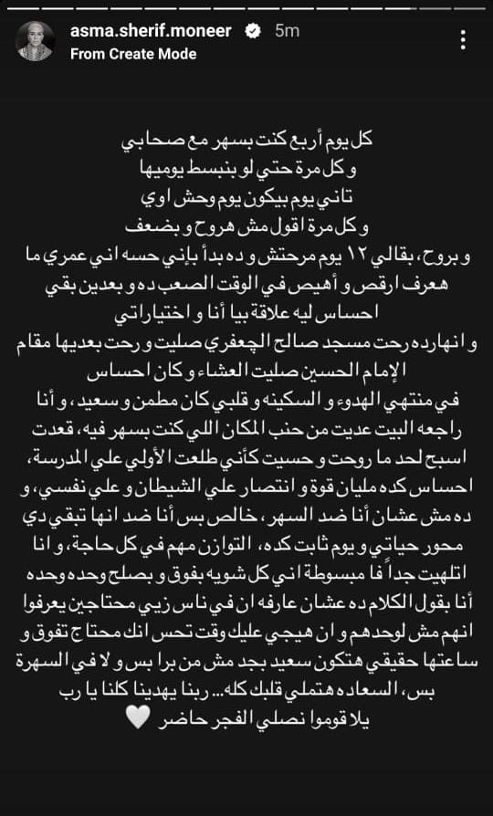 وكتبت أسما شريف منير منشورًا عبر حسابها الشخصي بموقع إنستجرام، جاء فيه: كل يوم أربعاء كنت بسهر مع صحابي، وكل مرة حتى لو بنبسط يوميها تاني يوم بيكون يوم وحش أوي، وكل مرة أقول مش هروح وبضعف وبروح، بقالي 12 يوم مرحتش، وده بدأ بأني حاسة إني عمري ما هعرف أرقص وأهيص في الوقت الصعب ده وبعدين بقى إحساس ليه علاقة بيا أنا واختياراتي.