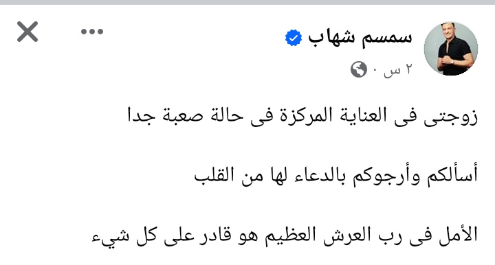 وكتب سمسم شهاب منشورًا عبر حسابه الشخصي بموقع التواصل الاجتماعي فيسبوك، جاء فيه: زوجتي في العناية المركزة في حالة صعبة جدًا، أسألكم الدعاء لها من القلب الأمل في رب العرش العظيم هو قادر على كل شيء.