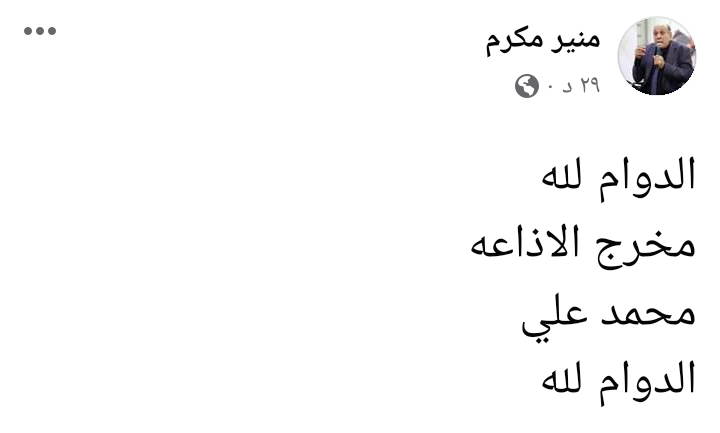 وكتب منير مكرم منشورًا، عبر حسابه الشخصي بموقع التواصل الاجتماعي فيس بوك، قال فيه: الدوام لله مخرج الإذاعة محمد علي.. الدوام لله.