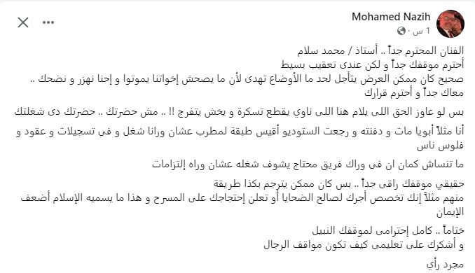 وكتب محمد نزيه منشورًا، عبر حسابه الشخصي بموقع التواصل الاجتماعي فيس بوك، قال فيه: الفنان المحترم جدًا أستاذ محمد سلام.. احترم موقفك جدًا ولكن عندي تعقيب بسيط، صحيح كان ممكن العرض يتأجل لحد ما الأوضاع تهدى، لأن ما يصحش إخواتنا يموتوا، وإحنا نهزر ونضحك معاك جدًا وأحترم قرارك، بس لو عاوز الحق، اللي يُلام هنا اللي ناوي يقطع تذكرة ويخش يتفرج، مش حضرتك لأن دي شغلتك.