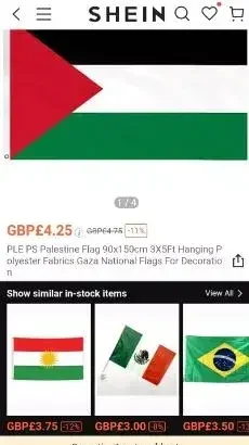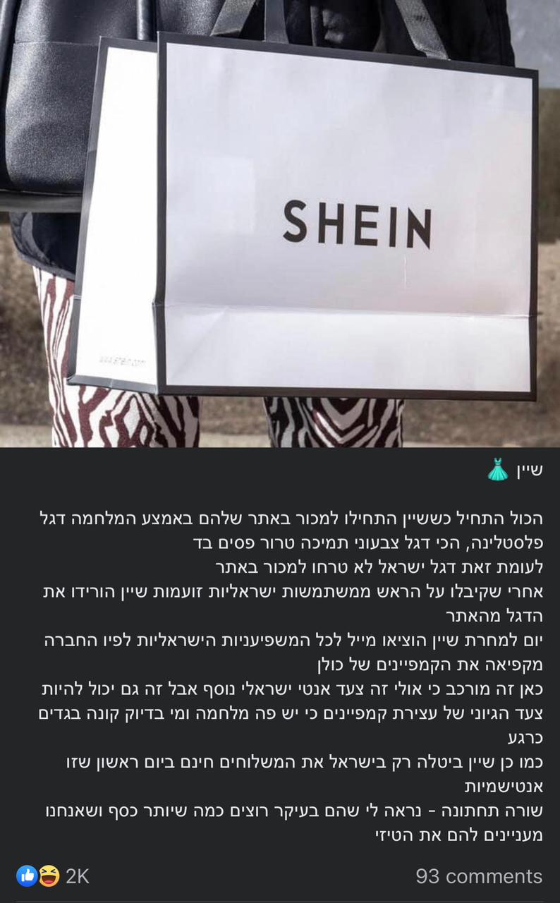 ونشرت إحدى المؤثرين الإسرائليين منشورا تقول فيه: بدأ كل شيء عندما بدأت شي إن في بيع علم فلسطين على موقعها على الإنترنت في منتصف الحرب، وهو العلم الذي يدعم الإرهاب، ومن ناحية أخرى لم يكلفوا أنفسهم عناء بيع العلم الإسرائيلي على الموقع.