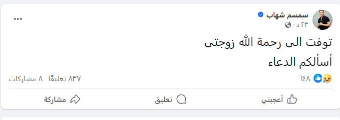 طالب المطرب سمسم شهاب من جمهوره الدعاء لزوجته بالرحمة والمغفرة، التي توفيت منذ ساعات قليلة بعد صراع مع السرطان، إذ كتب عبر حسابه بموقع فيس بوك: توفيت إلى رحمة الله زوجتي، أسألكم الدعاء.