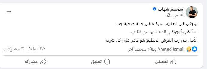 وطالب سمسم شهاب من جمهوره أمس الدعاء لزوجته بالشفاء، مشيرًا إلى أن حالتها صعبة، إذ كتب: زوجتي في العناية المركزة في حالة صعبة جدا أسألكم وأرجوكم بالدعاء لها من القلب، الأمل في رب العرش العظيم هو قادر على كل شيء.