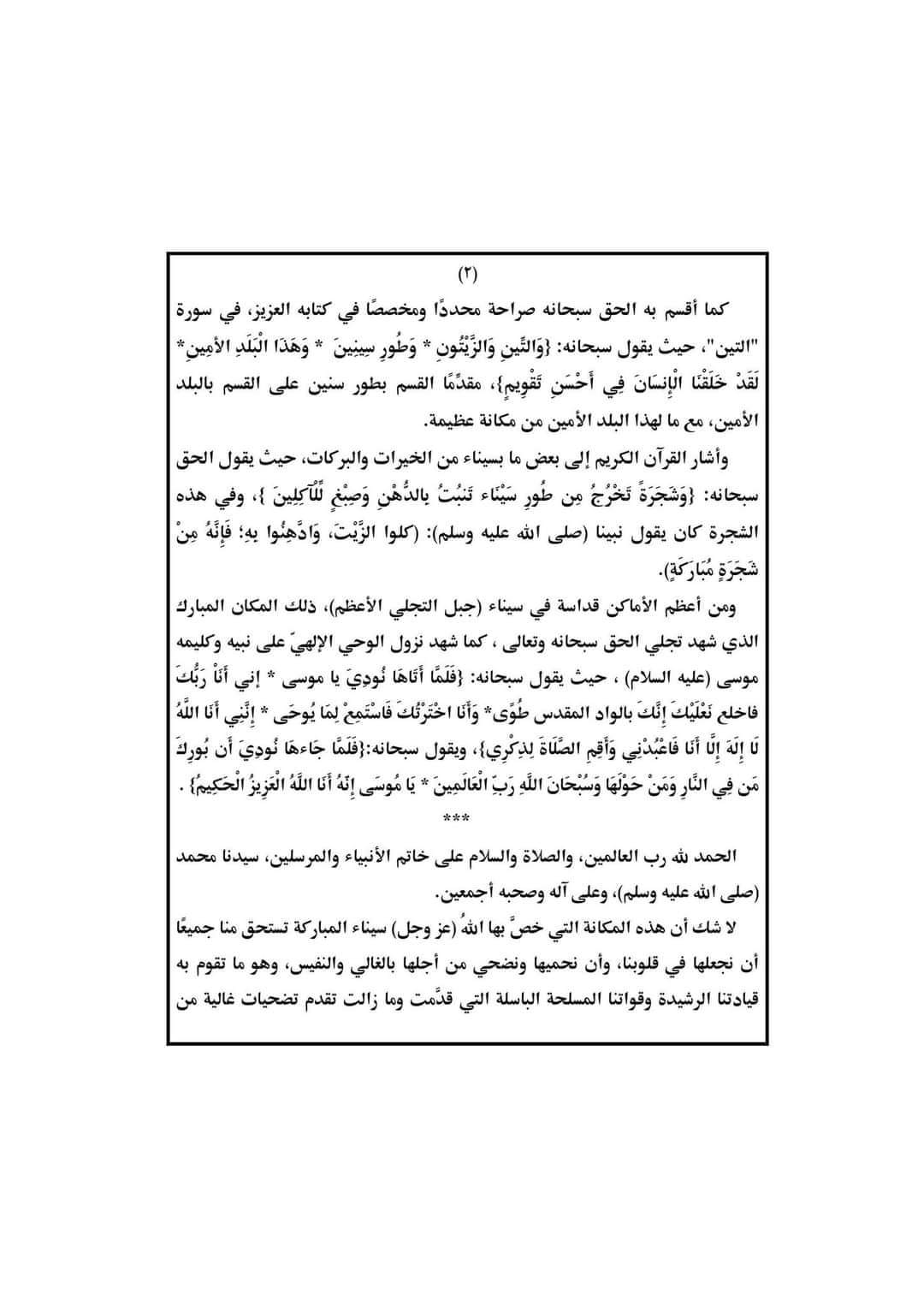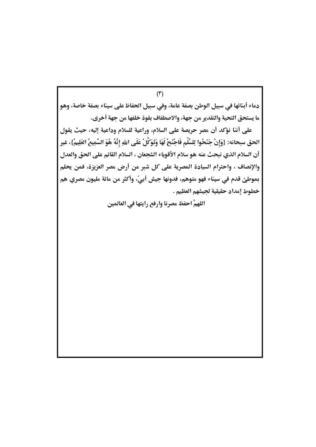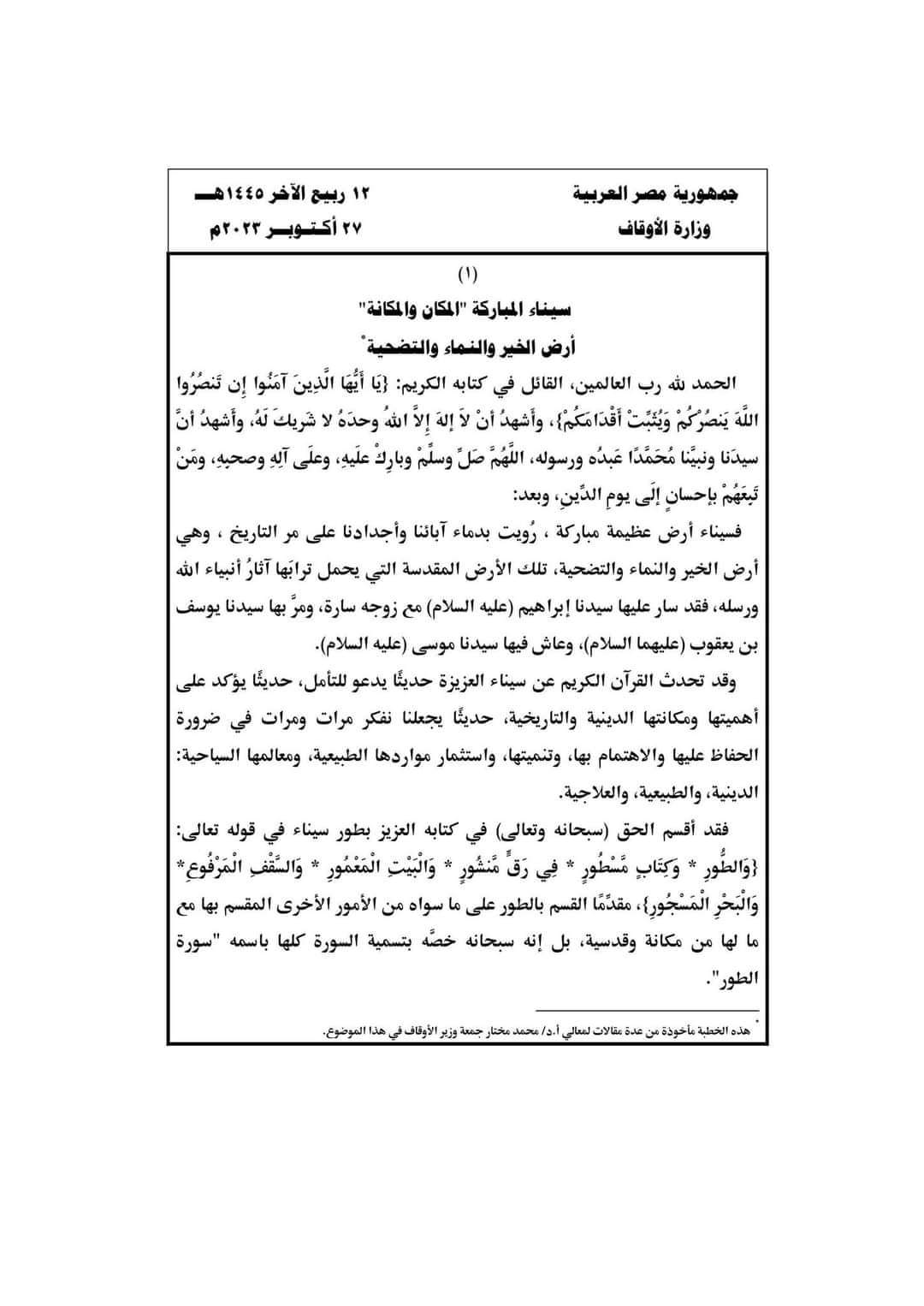 "الحمد لله رب العالمين القائل في كتابه الكريم: {يَا أَيُّهَا الَّذِينَ آمَنُوا إِن تَنصُرُوااللَّهَ يَنصُرُكُمْ وَيُثَبِّتْ أَقْدَامَكُمْ، وأشهدُ أنْ لا إلهَ إِلَّا اللهُ وحدَهُ لا شَريكَ لَهُ، وأشهدُ أنَّسيدنا ونبينا مُحَمَّدًا عبده ورسوله، اللهُمَّ صَلَّ وسلم وبارك عليهِ، وعلى آله وصحبه، ومَنْتبعهم بإحسان إلى يوم الدين، وبعد: فسيناء أرض عظيمة مباركة، رويت بدماء آبائنا وأجدادنا على مر التاريخ، وهي أرض الخير والنماء والتضحية تلك الأرض المقدسة التي يحمل ترابها آثار أنبياء الله ورسله، فقد سار عليها سيدنا إبراهيم «عليه السلام مع زوجه سارة، ومر بها سيدنا يوسف بن يعقوب «عليهما السلام وعاش فيها سيدنا موسى «علیه السلام».