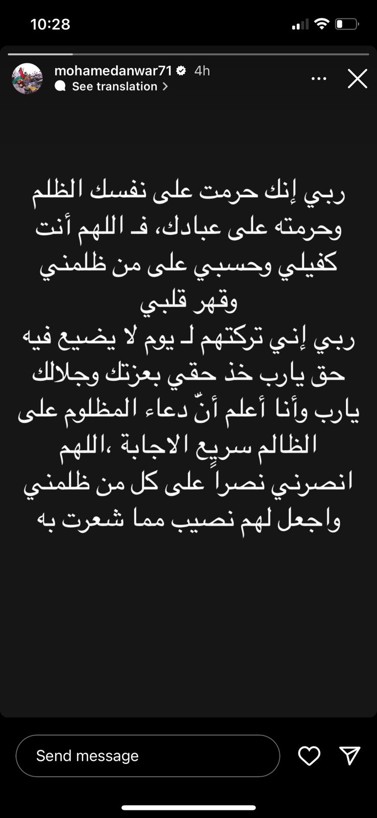 وكتب محمد أنور عبر خاصية ستوري لحسابه على انستجرام، الآتي: ربي إنك حرمت على نفسك الظلم وحرمته على عبادك، فاللهم أنت كفيلي وحسبي على من ظلمني وقهر قلبي.. ربي إني تركتهم ليوم لا يضيع فيه حق.. يارب خذ حقي بعزتك وجلالك.