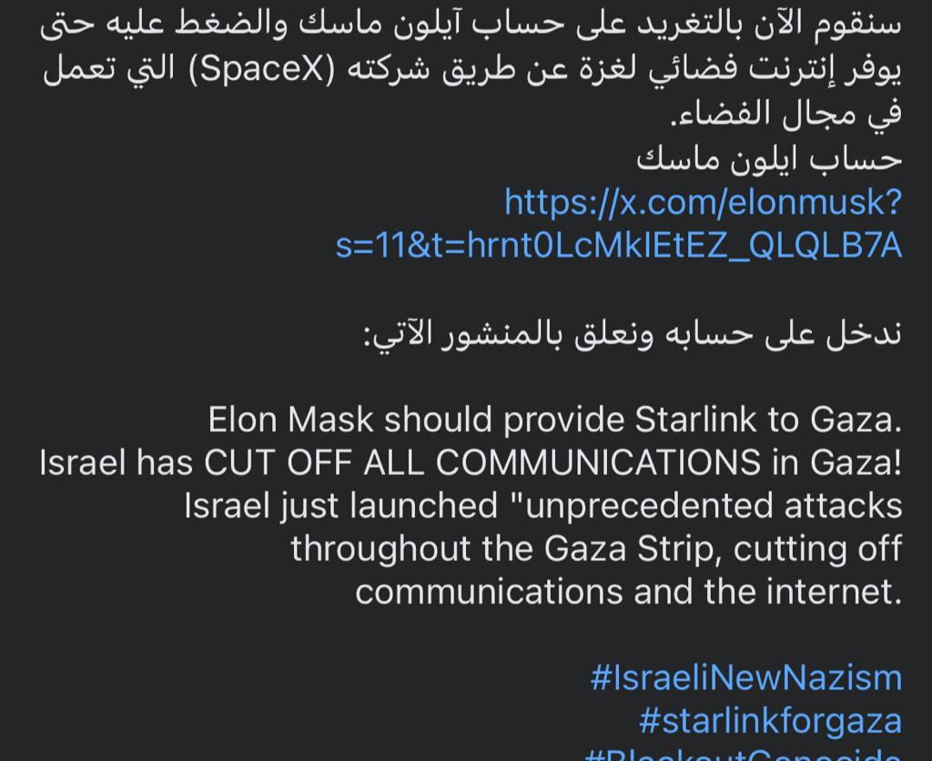 وقال أحد مستخدمي مواقع التواصل الاجتماعي: سنقوم الآن بالتغريد على حساب إيلون ماسك والضغط عليه حتى يوفر إنترنت فضائي لغزة عن طريق شركته (SpaceX) التي تعمل في مجال الفضاء.