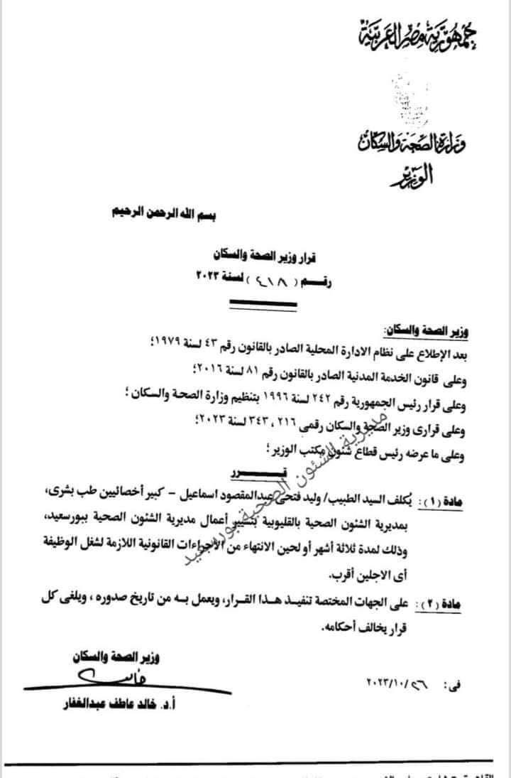 وتضمن قرار وزير الصحة والسكان رقم 418 لسنة 2023، يكلف الدكتور وليد فتحي عبد المقصود إسماعيل كبير أخصائيين طب بشري بمديرية الشؤون الصحية بالقليوبية، بتسيير أعمال المديرية ببورسعيد وذلك لمدة 3 أشهر أو لحين الانتهاء من الإجراءات القانونية اللازمة لشغل الوظيفة أي الأجلين أقرب.