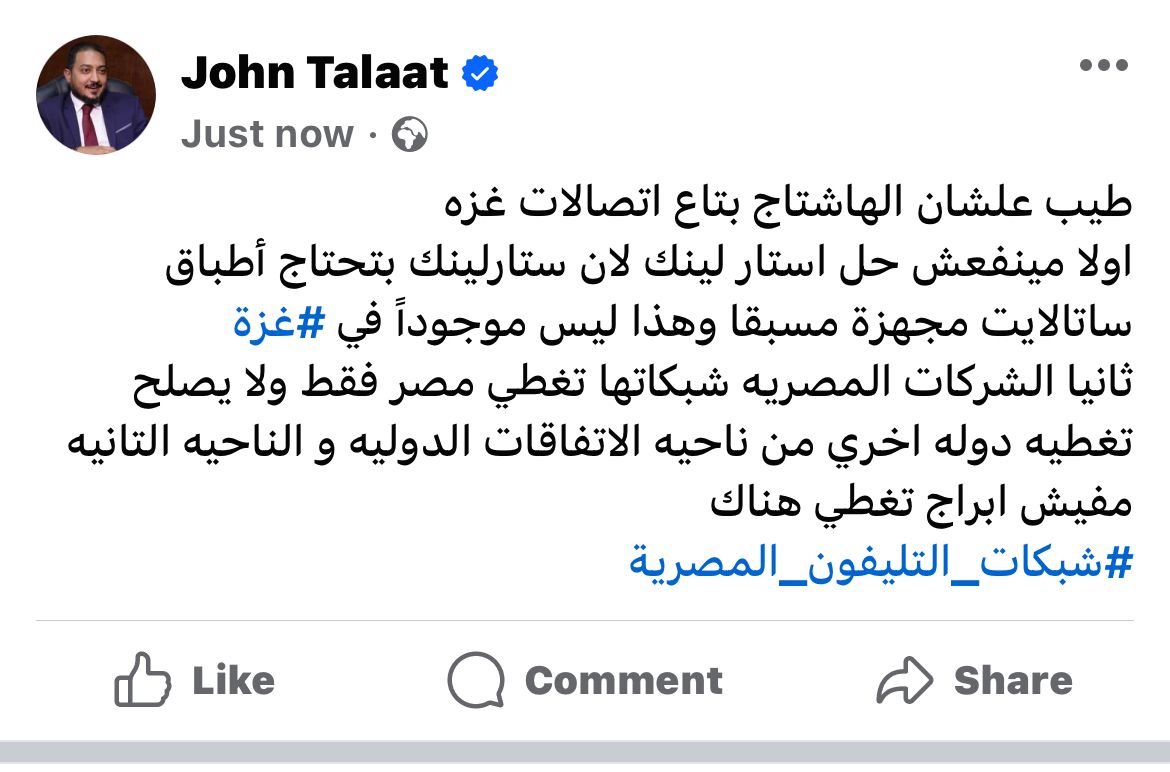 ومن جانبه قال عضو مجلس النواب السابق والخبير في مجال الاتصالات جون طلعت حول ذلك الأمر: طيب علشان الهاشتاج بتاع اتصالات غزة:
