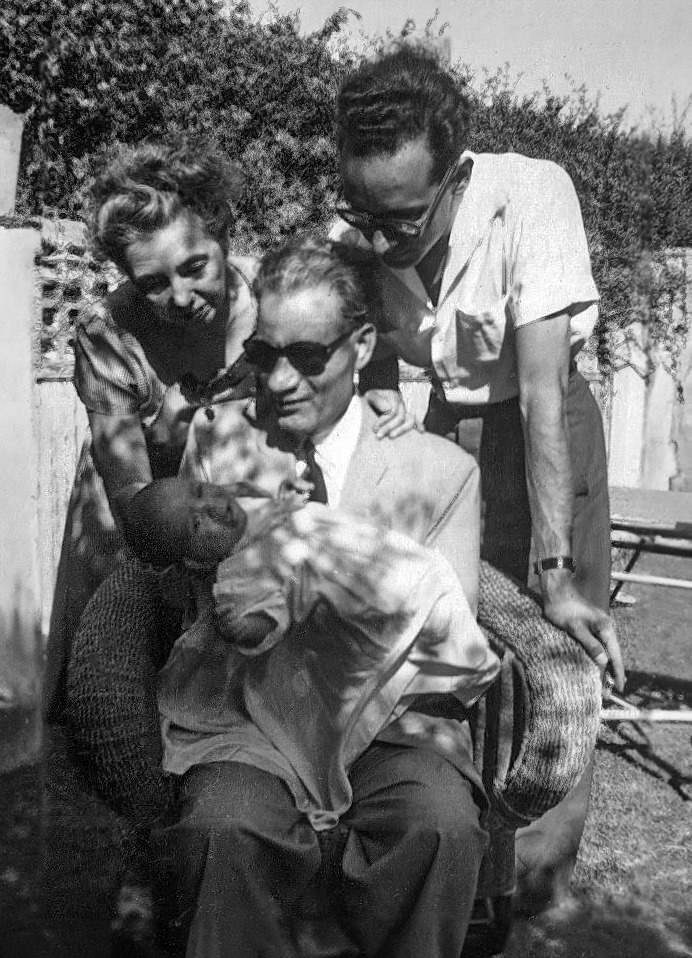 وفي صورة أخرى يظهر العميد طه حسين جالسا على كرسي يحمل طفلته أمينة ويداعبها والابتسامة مرسومة، ويقف خلفه زوجته سوزان وابنهما مؤنس.