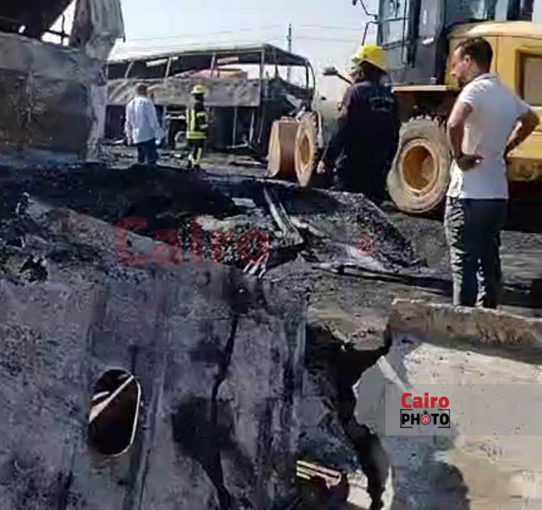 والتهمت النيران 6 سيارات من بينهم أتوبيس و3 سيارات ملاكي وسيارة نقل ثقيل، ويقوم رجال المرور بسحب الكثافات المرورية على طريق إسكندرية الصحراوي لتسيير حركة المركبات.