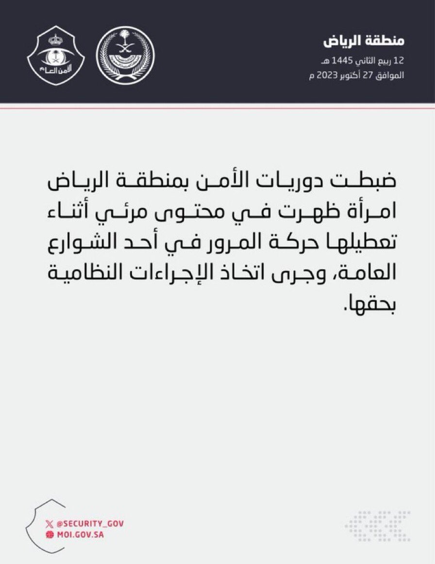 الأمن العام بالعاصمة السعودية الرياض، ألقى القبض على السيدة المصرية، ووجه لها تهم تعطيل حركة المرور في أحد الشوارع العامة، وجرى اتخاذ الإجراءات النظامية بحقها.