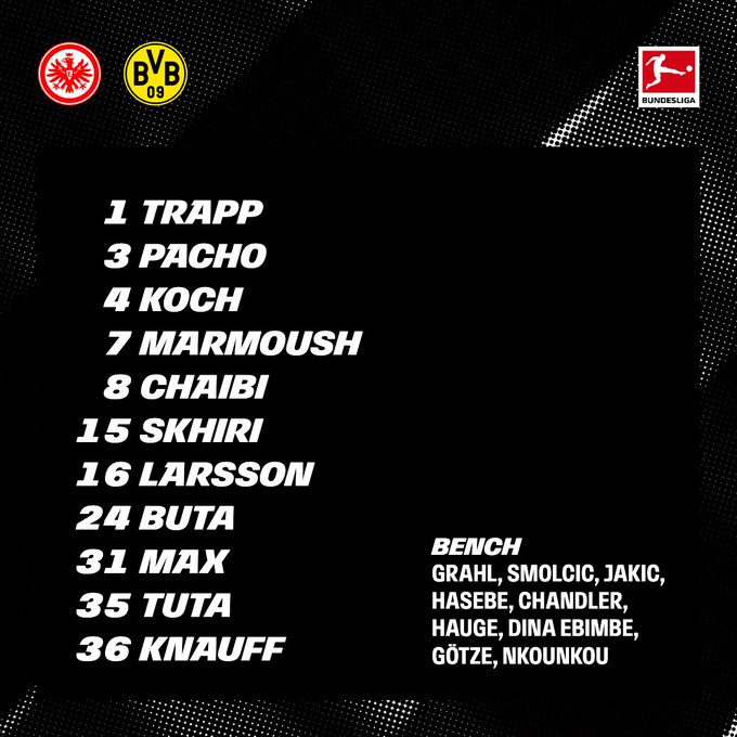 وجاء تشكيل إينتراخت فراكفورت لمواجهة بوروسيا دورتموند في الجولة التاسعة من الدوري الألماني، على النحو التالي:
