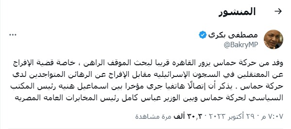 وكتب مصطفى بكري، عبر حسابه الرسمي على موقع التواصل الاجتماعي إكس تويتر سابقا: وفد من حركة حماس، يزور القاهرة قريبا، لبحث الموقف الراهن، خاصة قضية الإفراج عن المعتقلين في السجون الإسرائيلية مقابل الإفراج عن الرهائن المتواجدين لدى حركة حماس.