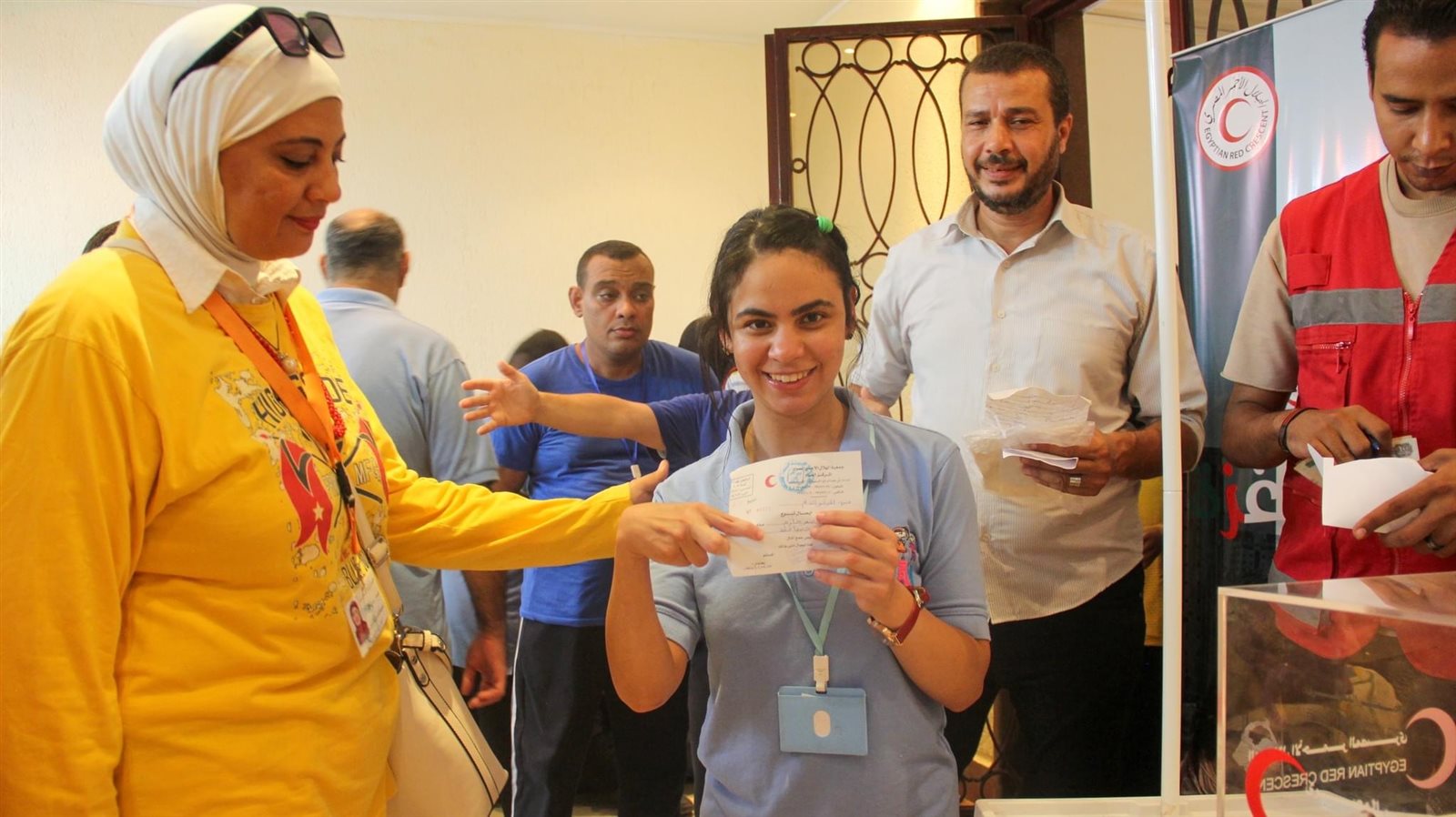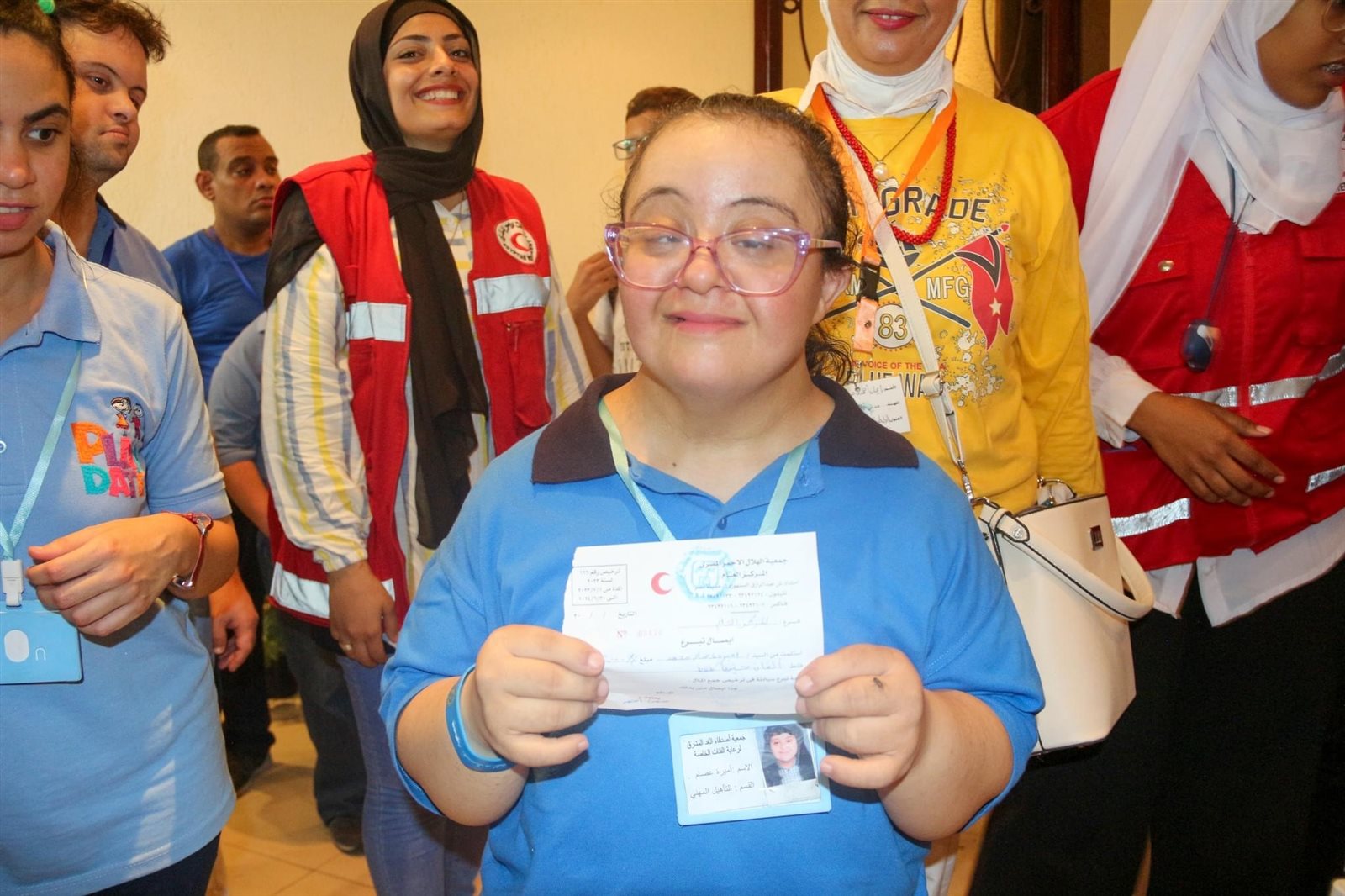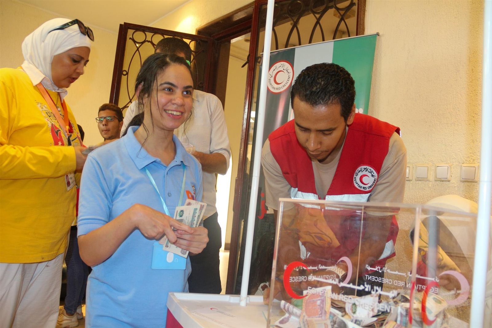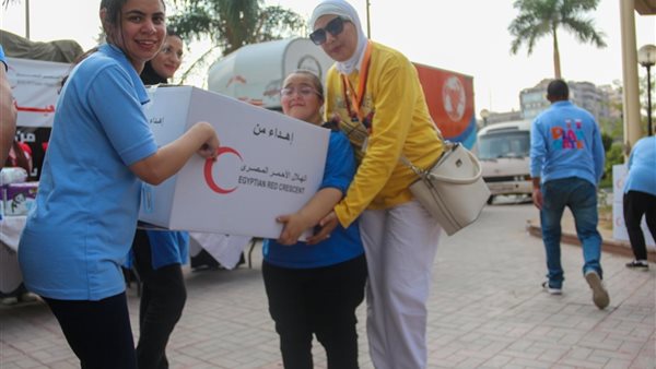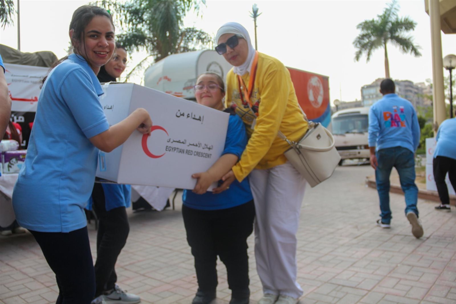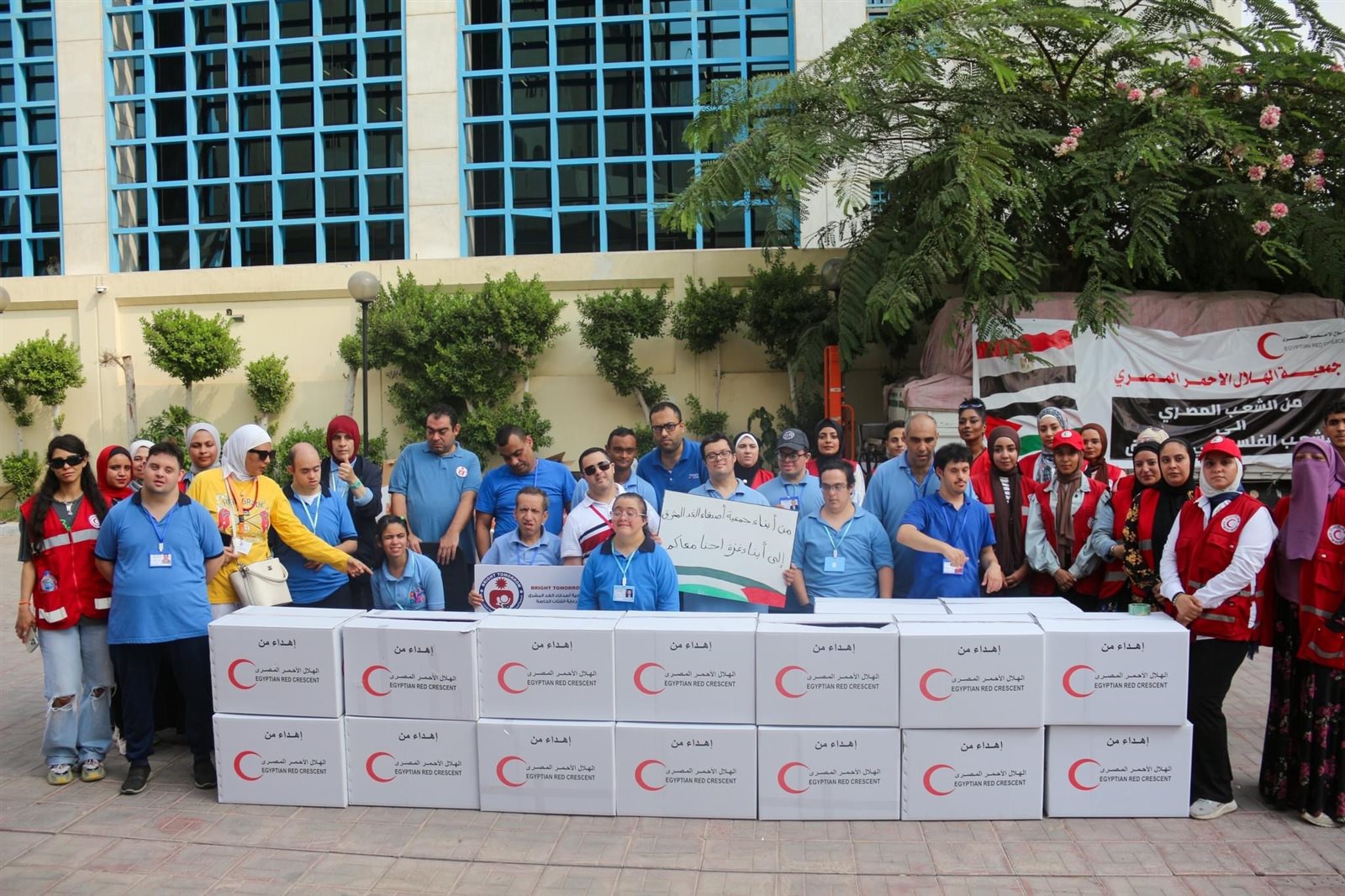 أطفال من ذوي الهمم يشاركون الهلال الأحمر في تعئبة المساعدات للشعب الفلسطيني.. ويتبرعون بمبالغ مالية| صور