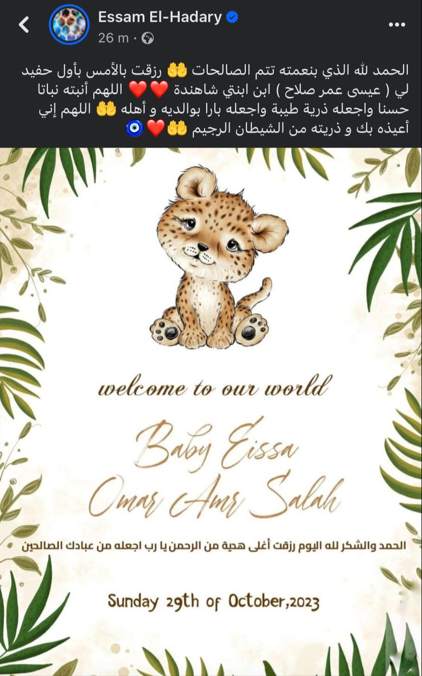 وكتب عصام الحضري، في منشور له عبر صفحته الرسمية بموقع التواصل الاجتماعي فيسبوك، الحمد لله الذي بنعمته تتم الصالحات، رزقت أمس بأول حفيد لي، عيسى عمر صلاح، ابن ابنتي شاهندة، اللهم انبته نباتًا حسنًا واجعله ذرية طيبة واجعله بارًا بوالديه وأهله، اللهم إني أعيذه بك وذريته من الشيطان الرجيم.