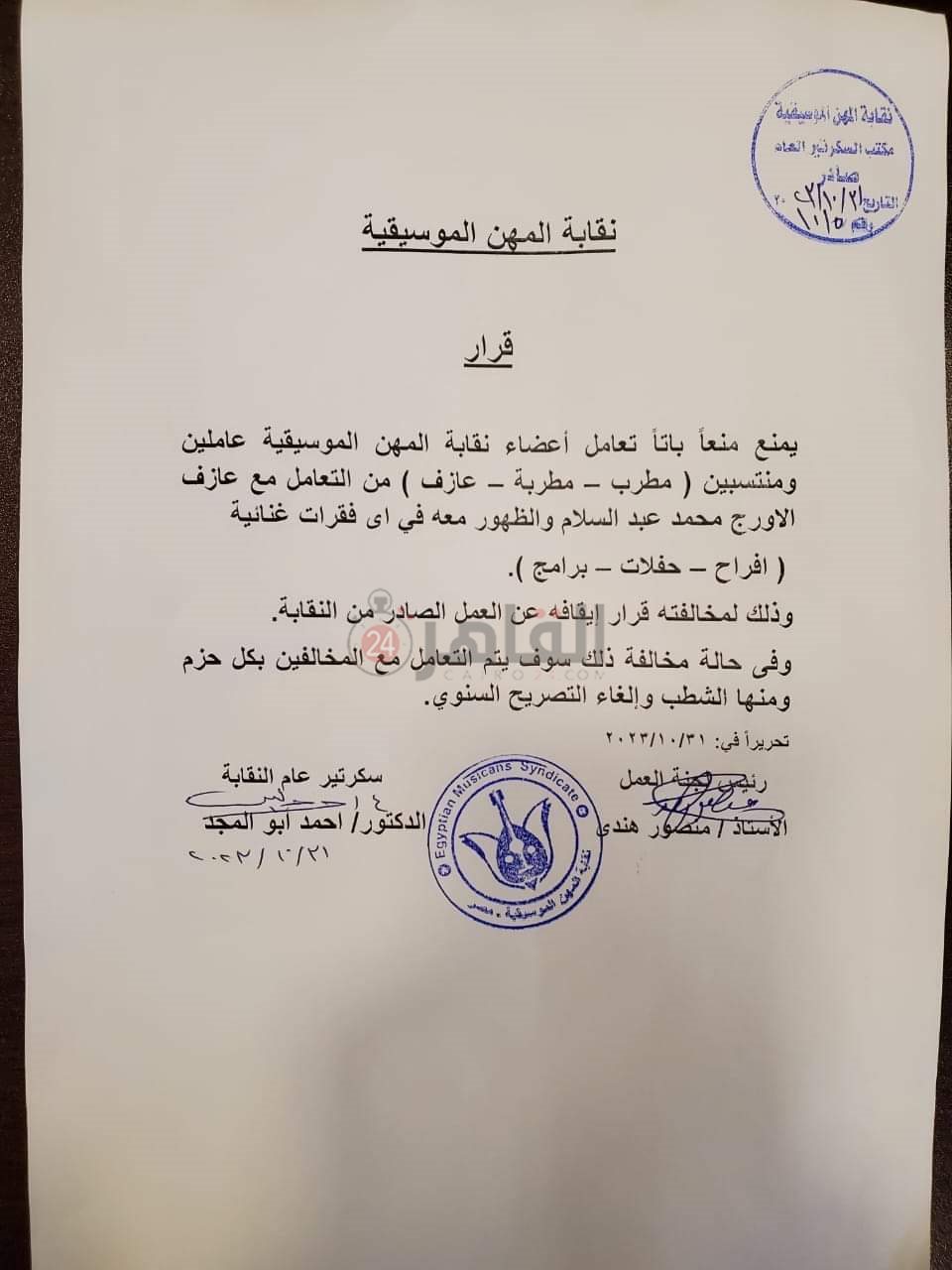 وكانت أصدرت نقابة المهن الموسيقية، في وقت سابق، قرارًا بإيقاف التصريح السنوي لعازف الأورج محمد عبد السلام، وجاء نص بيان نقابة على الآتي: بعد الاطلاع على التوصيات الواردة إلينا من السادة الشئون القانونية، قررت نقابة المهن الموسيقية إيقاف عازف الأورج محمد عبد السلام معوض (تصريح سنوي) عن العمل، وذلك لحين مثوله أمام النقابة، لما بدر منه من سلوك يخالف القانون رقم 35 لسنة 1878 وتعديلاته وللائحة الداخلية، ويعمم ذلك القرار على جميع المنشآت ومنظمي الحفلات وأصحاب القرار، على أن يسري ذلك القرار من تاريخ 25 أكتوبر.