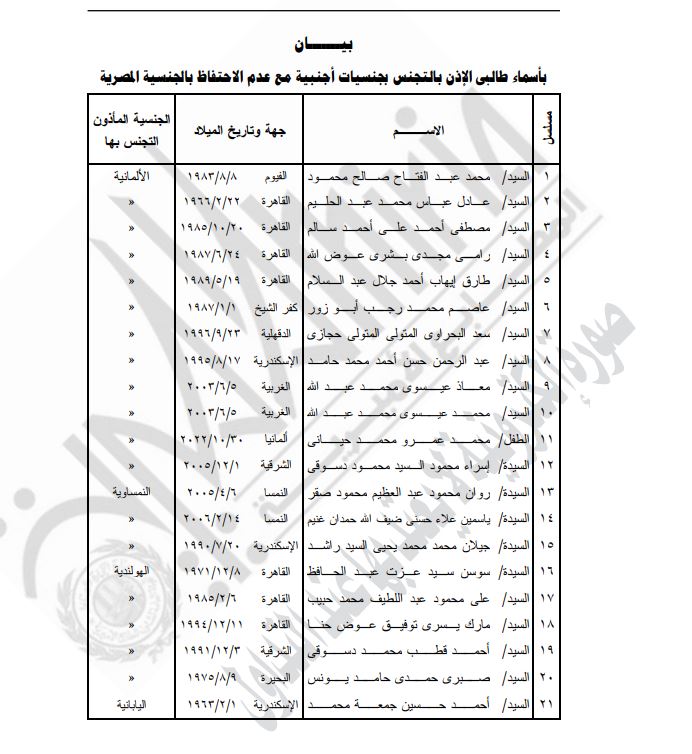 السماح لـ21 مواطنا بالحصول على الجنسية الأجنبية مع عدم الاحتفاظ بالمصرية