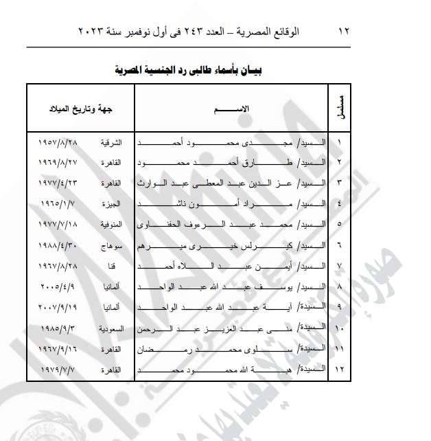 ونصت المادة الأولى من القرار على أن ترد الجنسية المصرية لكل من الاثنى عشر شخصا المدرجة أسمائهم بالبيان المرفق أولهم مجدى محمود أحمد، وآخرهم السيدة هبة الله محمود محمد.