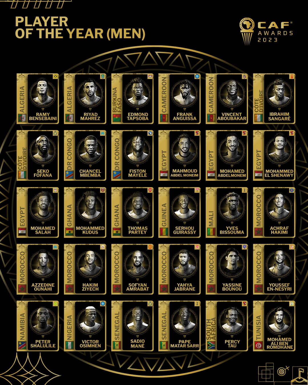 وبجانب محمد صلاح، ضمت القائمة عددًا من اللاعبين المميزين، جاء على رأسهم المغربي أشرف حكيمي ومواطنه ياسين بونو والنيجيري فيكتور أوسيمين والجزائري رياض محرز والسنغالي ساديو ماني.