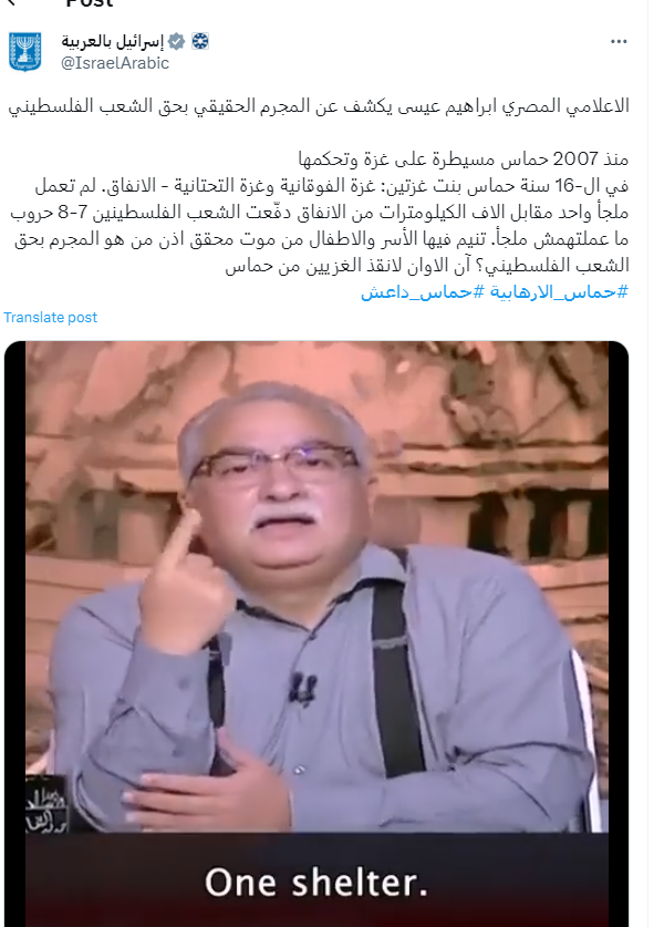 احتفت صفحة إسرائيل بالعربية، بحديث الإعلامي إبراهيم عيسى بشان الوضع في غزة، الذي انتقد فيه طريقة إدارة حركة حماس لشئون القطاع خلال السنوات الماضية.