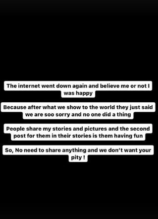 وأردف: لأن بعد ما قدمناه للعالم لم يفعل أحد شيئا، الناس يشاركون قصصي وصوري، والمنشور الثاني لهم، هو الاستمتاع بوقتهم، لذلك ليس هناك حاجة لمشاركة أي شيء، لا نريد شفقتكم.