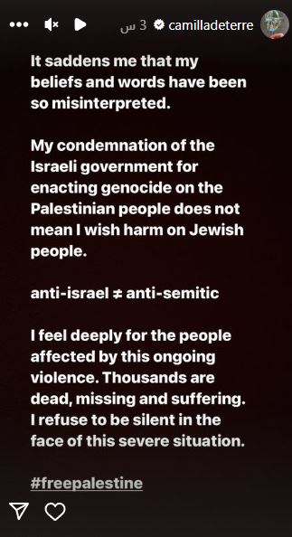 وجاء رد كاميلا على طردها من العمل كالاتي، وذلك في بيان عبر حسابها الرسمي قائلة: يؤسفني أن سوء فهم الناس لمعتقداتي وكلامي.. إدانتي للحكومة الإسرائيلية لما تقوم به من إبادة جماعية للشعب الفلسطيني لا تعني أنني أتمنى إلحاق الضرر باليهود، مؤكدة على استمرارها في دعمها للقضية الفلسطينية.