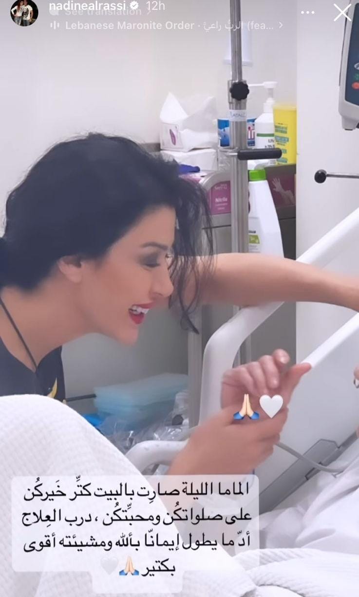 ونشرت نادين الراسي، صورة وهي تمسك بيد والدتها،عبر خاصية ستوري على حسابها الشخصي بموقع تبادل الفيديوهات والصور انستجرام، وكتبت: ماما الليلة صارت بالبيت كتر خيركم على صلواتكم ومحبتكم، الإيمان بالله ومشيئته أقوى بكتير.