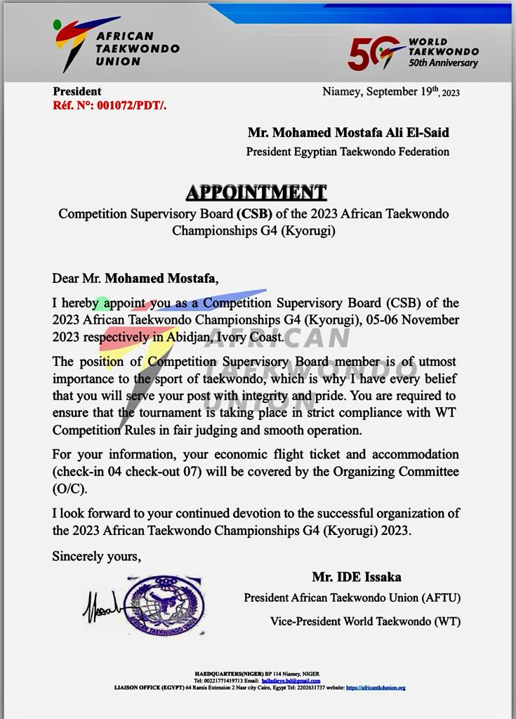 أعلن الاتحاد الإفريقي للتايكوندو اختيار المستشار محمد مصطفى رئيس الاتحاد المصري للتايكوندو ونائب رئيس الاتحاد العربي للتايكوندو مشرفان فنيان CSB على بطولة إفريقيا للتايكوندو للكبار G4 رجال وسيدات المقرر إقامتها في عاصمة كوت ديفوار أبيدچان.