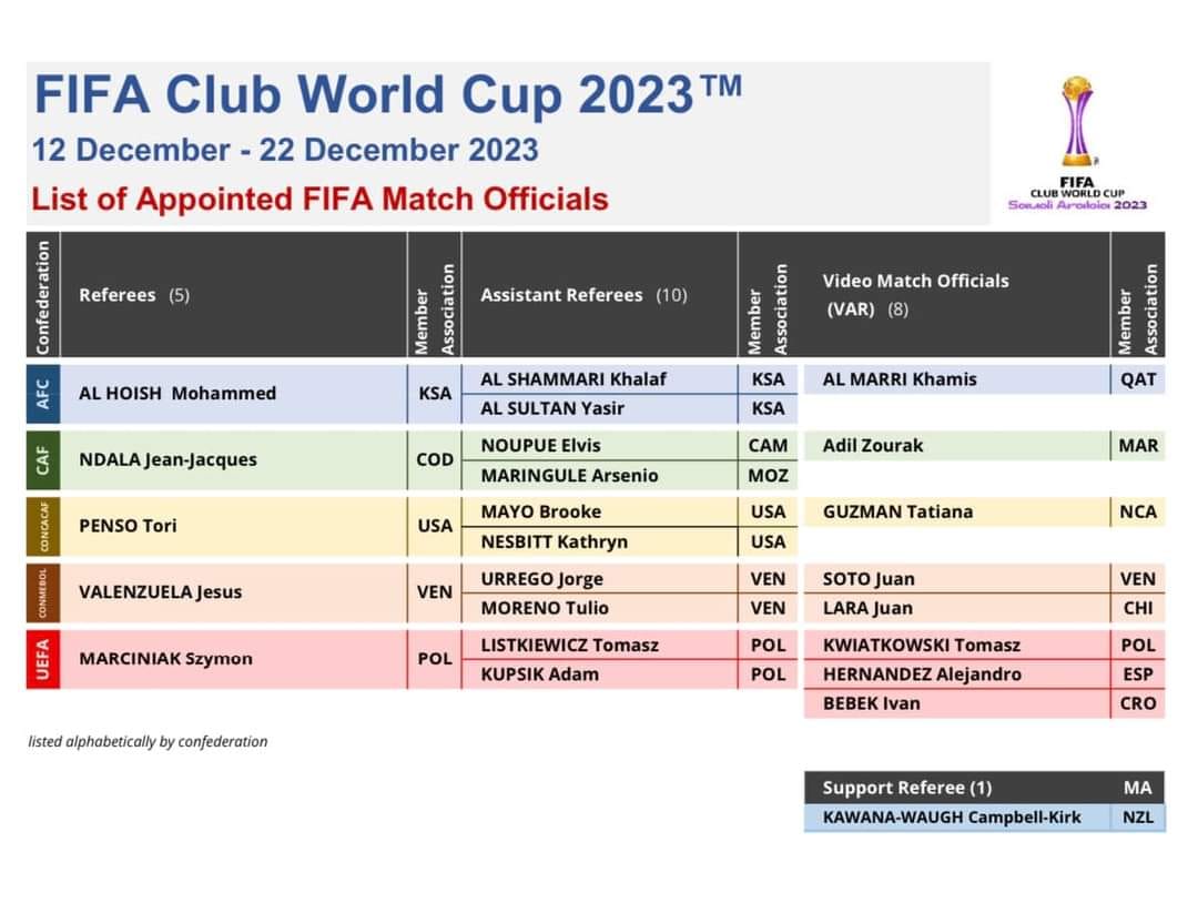 وجاءت قائمة حكام بطولة كأس العالم للأندية كاملة على النحو التالي: