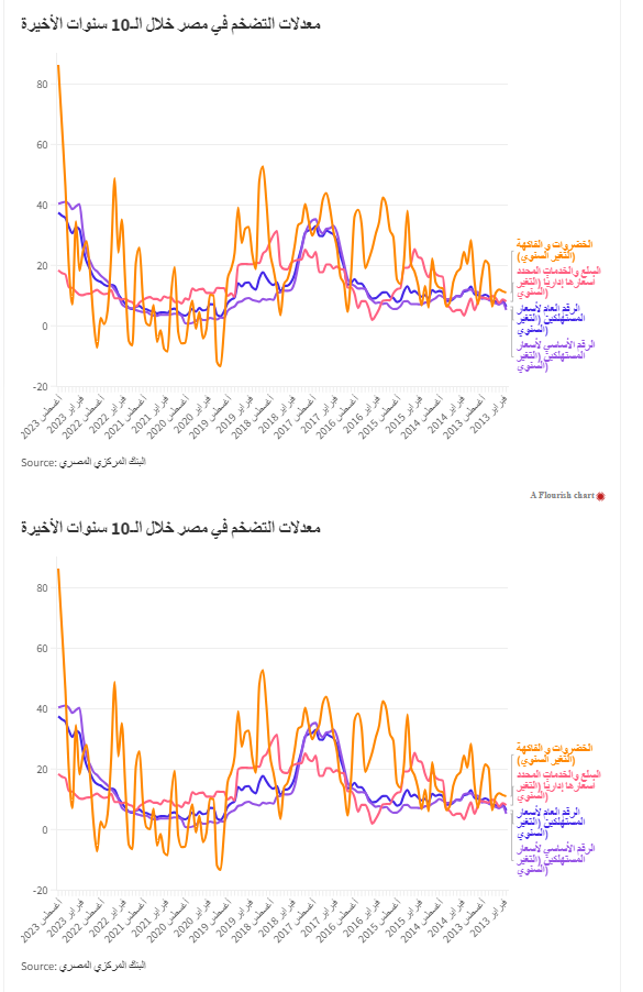 جدير بالذكر، أن التضخم في مصر صعد خلال الأعوام الماضية من 6.2% في عام 2013 إلى أكثر من 37% في 2023، ويظهر في الرسم البياني التالي معدلات التضخم في مصر خلال الـ10 سنوات الأخيرة:
