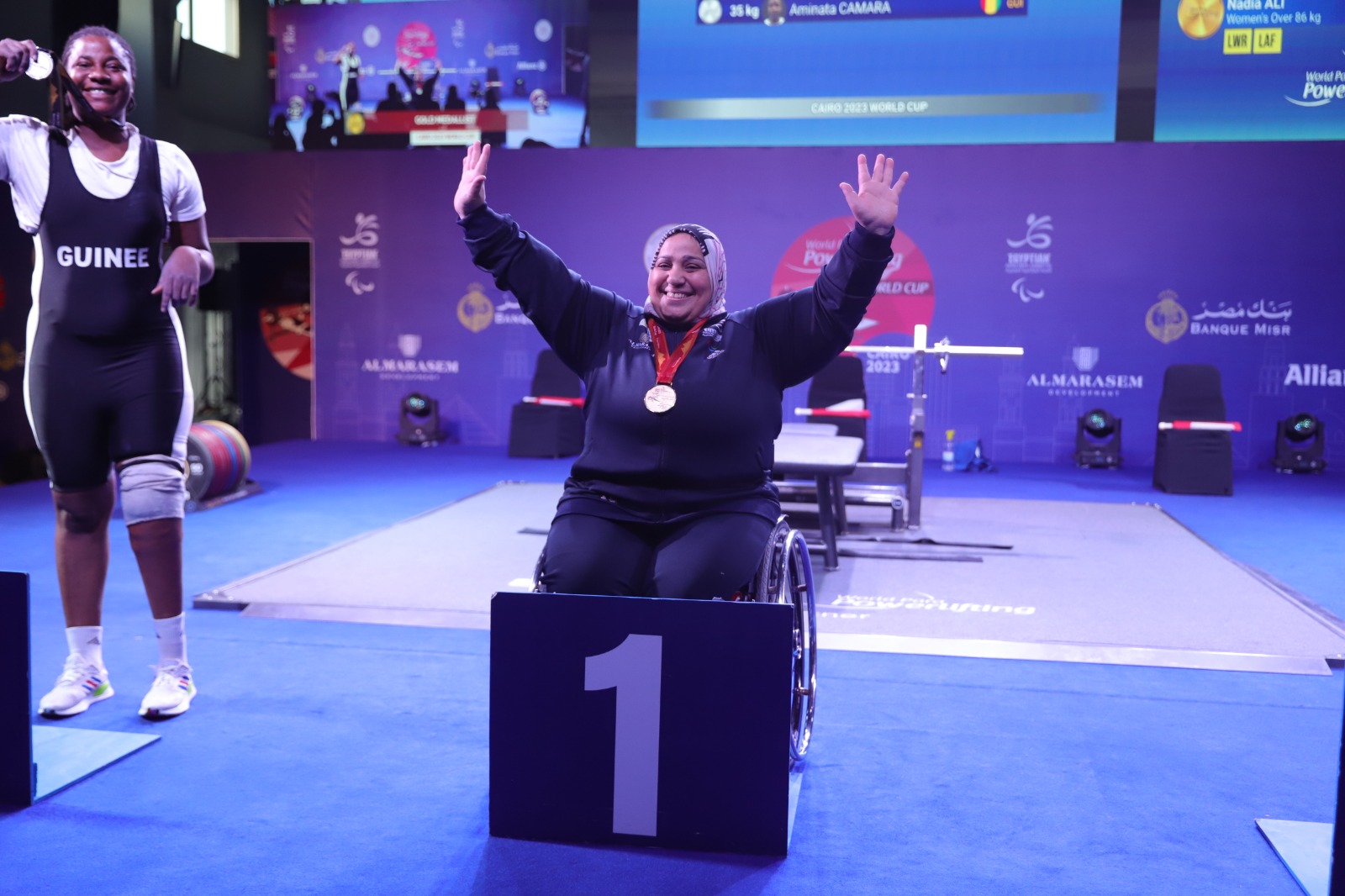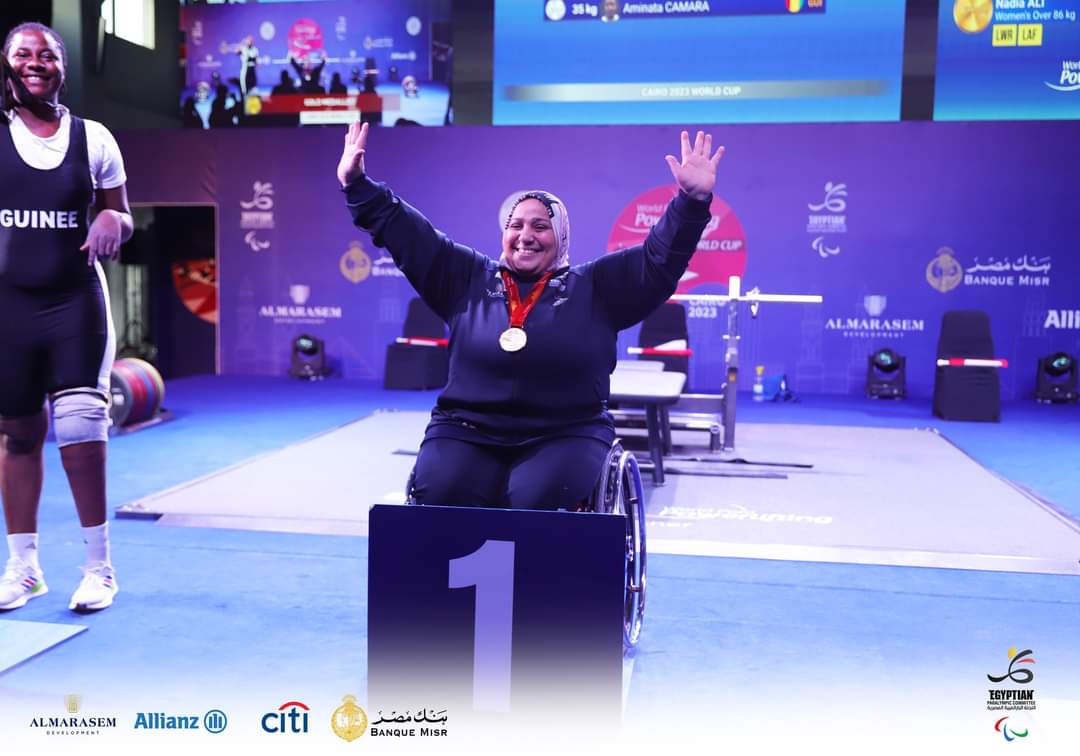 - البطلة المصرية نادية علي تحقق الميدالية الذهبية بعد رفع ثقل 151 كجم.