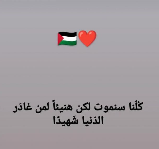 وقال عبر حسابه بإنستجرام: الحمد لله أنا وعائلتي بخير، اشتقت لكم كتير، كلنا سنموت، لكن هنيئا لمن غادر الدنيا شهيدًا، موضحًا أنه كان على وشك الاستشهاد، وأنه في الأربعة أيام الماضية شهد عشرات الجرائم بالقرب من بيته ومرت الليالي دون أن ترى أعين أسرته النوم، بسبب شدة القصف بالقرب منه وكل دقيقة وثانية كانت هناك ضربة وقصف من قوات العدو، ويستشهد في كل واحدة منها ما لا يقل عن 10 و20 شهيد.