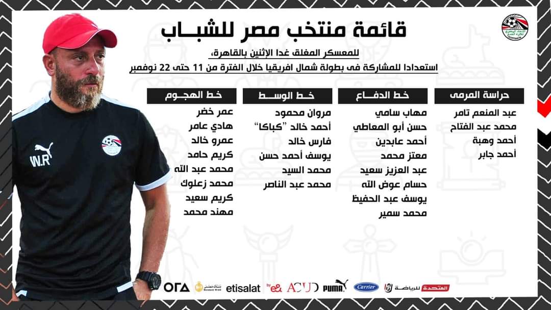 أعلن وائل رياض، المدير الفني لمنتخب مصر للشباب، قائمة اللاعبين الذين وقع عليهم الاختيار للدخول في معسكر مغلق غدا الاثنين في القاهرة؛ استعدادا للمشاركة في بطولة شمال إفريقيا خلال الفترة من 11 حتى 22 نوفمبر الجاري.