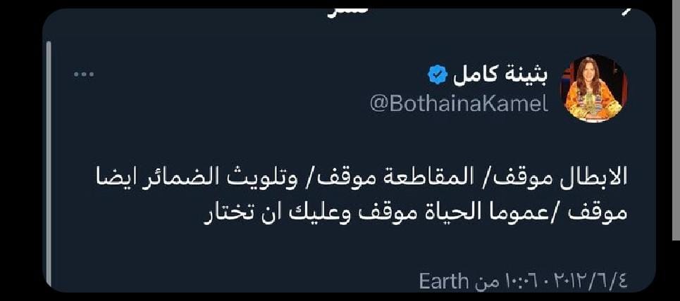 وفوجئ المتابعون بموقف بثينة المتناقض مع المقاطعة، وبدأوا بنشر بوست سابق لها وتذكير لكلماتها، كانت قد أشارت فيه إلى دعمها للمقاطعة قائلة: الأبطال موقف، المقاطعة موقف، وتلويث الضمائر أيضا موقف، الحياة موقف وعليك أن تختار.