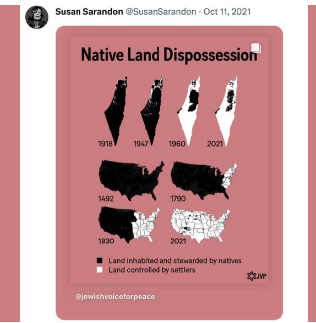 وكانت سوزان ساراندون دائمًا مدافعة عن القضية الفلسطينية، ففي عام 2021 نشرت صورة، فيها مقارنة بين ما حصل للفلسطينيين في بلدهم فلسطين، وما حصل للسكان الأصليين في الولايات المتحدة، الذين يطلق عليهم اليوم وصف الهنود الحمر، وكأنها تقول إن الحكومة الأمريكية والاحتلال الإسرائيلي وجهان لعملة واحدة.