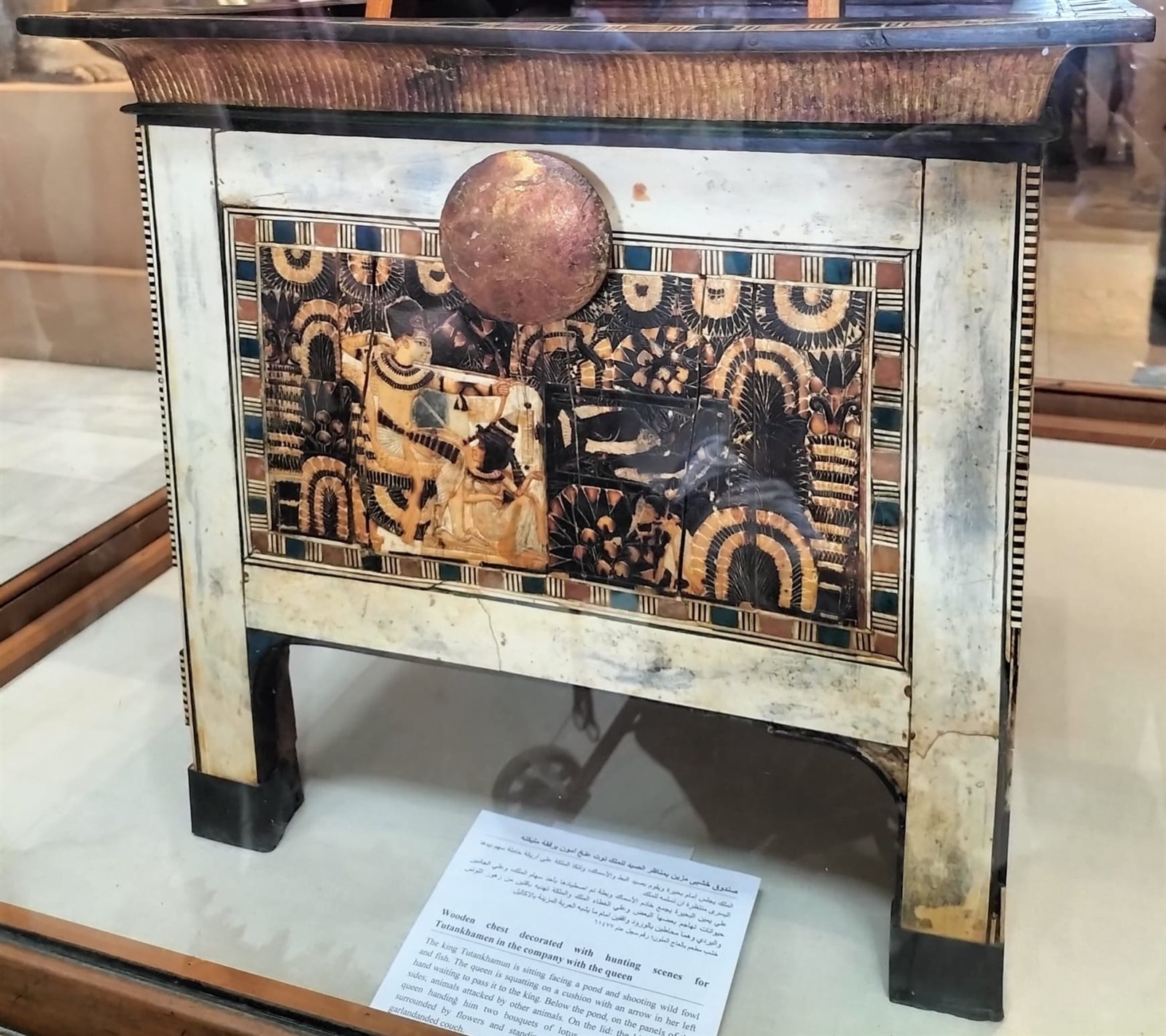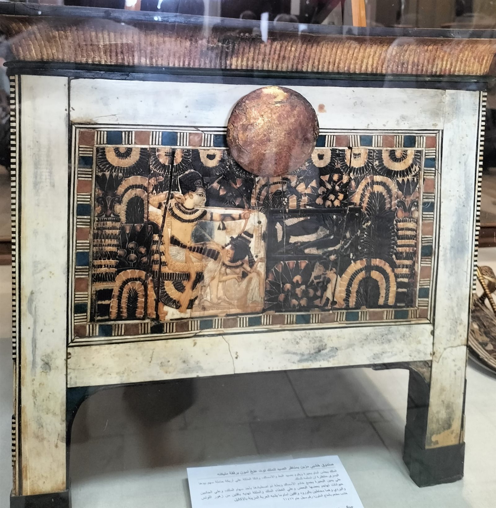 أعلنت إدارة المتحف المصري بالتحرير، عن عرض صندوق خشبي مزين بمناظر الصيد للملك توت عنخ آمون برفقة مليكته.