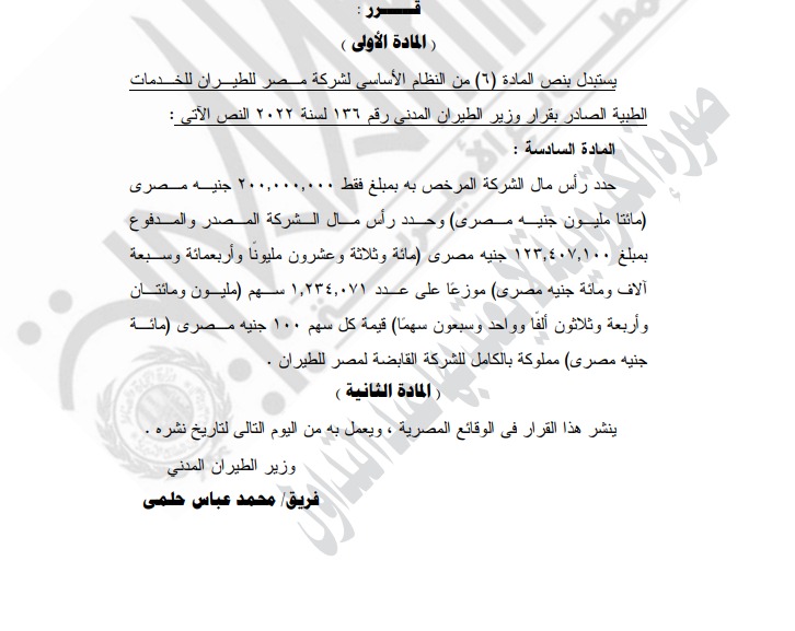 في وقت سابق، نشرت الجريدة الرسمية قرار وزير الطيران المدني، الخاص بشأن تعديل نص المادة 6 من النظام الأساسي لشركة مصر للطيران للخدمات الجوية.