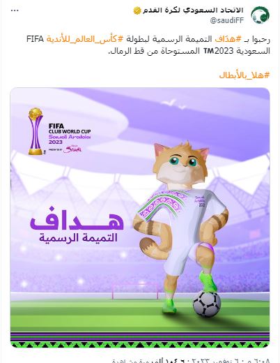 ونشر الاتحاد السعودي لكرة القدم صورة لتميمة كأس العالم للأندية 2023 عبر حسابه الإلكتروني الرسمي على منصة إكس، وعلق عليها: رحبوا بـ"هدَاف" التميمة الرسمية لبطولة كأس العالم للأندية FIFA السعودية 2023 المستوحاة من قط الرمال.