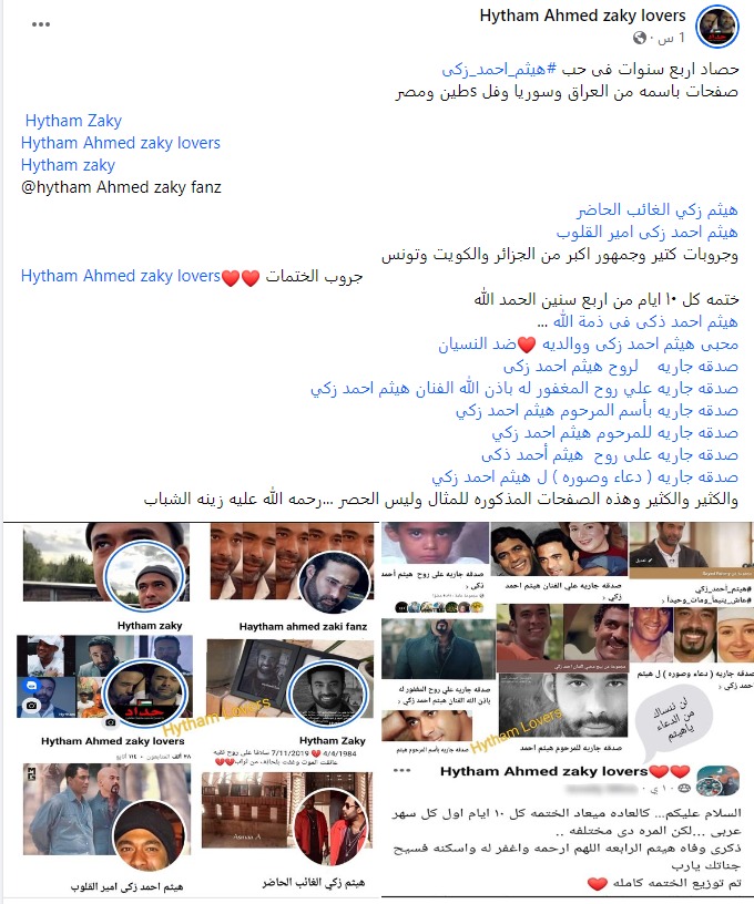 كما أكدت جهاد أن أعضاء الجروب يجرون خاتمة قرآن على روح هيثم احمد زكي، كل أول شهر، وتستمر هذه الخاتمة حتى يوم 10 في الشهر، ومازالت هذه الفكرة تُنفذ منذ 4 سنوات، موضحةً: أنا من جمهوره، وعملت له الصفحة، عشان الدعوات والرحمات تنزل عليه، وكل 10 ايام بنعمله ختمة قرآن، ومستمرين عليها من يوم وفاته لحد النهاردة، ومن خلال الجروب تواصلت مع مجموعات أخرى، اجتمعت على حب الراحل، منهم سيدة من طنطا دشنت جروبًا على فيس بوك، للدعاء لهيثم.