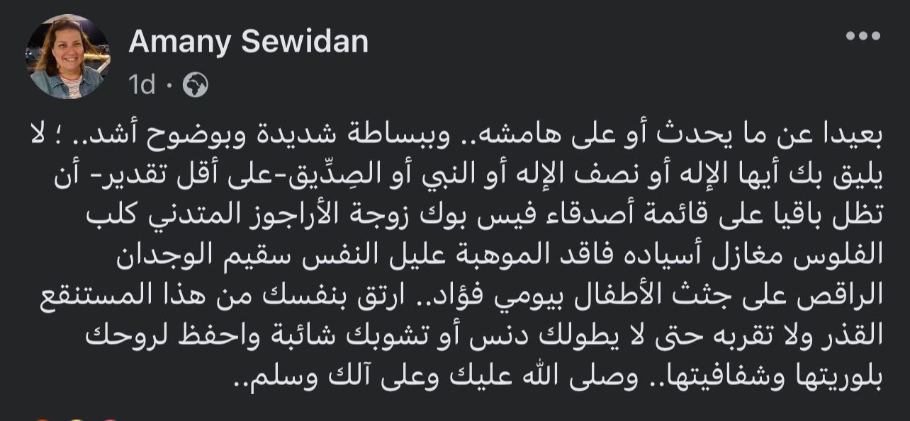 وكتبت أماني سويدان منشورًا عبر حسابها الرسمي بـ فيس بوك، قائلة: بعيدًا عن ما يحدث أو على هامشه، ببساطة شديدة وبوضوح أشد لا يليق بك أيها الإله أو نصف الإله أو النبي أو الصديق -علي أقل تقدير- أن تظل باقيا على قائمة أصدقاء فيس بوك زوجة الأراجوز المتدني كلب الفلوس مغازل أسياده فاقد الموهبة عليل النفس سقيم الوجدان الراقص على جثث الأطفال بيومي فؤاد، ارتق بنفسك من هذا المستنقع القذر ولا تقربه حتى لا يطولك دنس أو تشوبك شائبة واحفظ لروحك بلوريتها وشفافيتها.. وصلي الله عليك وعلى آلك وسلم.
