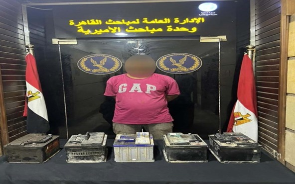 ضبط عاطل له معلومات جنائية في دائرة قسم شرطة الأميرية، لسرقة بطارية سيارة حال توقفها بدائرة القسم، وبمواجهته أقر بمزاولته نشاطا إجراميا تخصص في سرقة البطاريات من داخل السيارات بأسلوب الضغط على الكابود، وتم بإرشاده ضبط كافة البطاريات المستولى عليها بمسكنه، وباستدعاء المجني عليهم اتهموه بالسرقة.