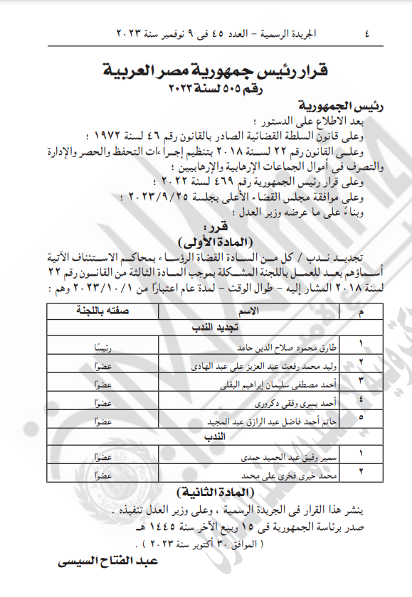 ونص قرار رئيس الجمهورية رقم 505 لسنة 2023 على أن يجدد ندب كل من القضاة الرؤساء بمحاكم الاستئناف الآتية أسماؤهم بعد للعمل باللجنة المشكلة بموجب المادة الثالثة من القانون رقم 22 لسنة 2018 المشار إليه- طوال الوقت- لمدة عام اعتبارًا من 2023/10/1 وهم: